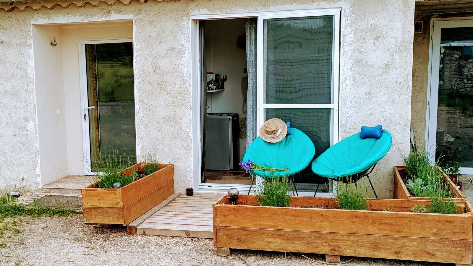 Between Sault and Monieux, just a few hundred meters from three GR tracks, the farmhouse is quietly situated at the end of a dirt track. A bay window opens onto a living area with a small table, microwave, kettle and fridge (no sink). The sleeping area is separated by a curtain. It includes a double bed. A small bathroom with shower, toilet and washbasin follows.