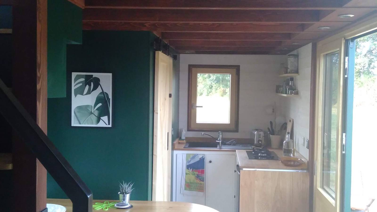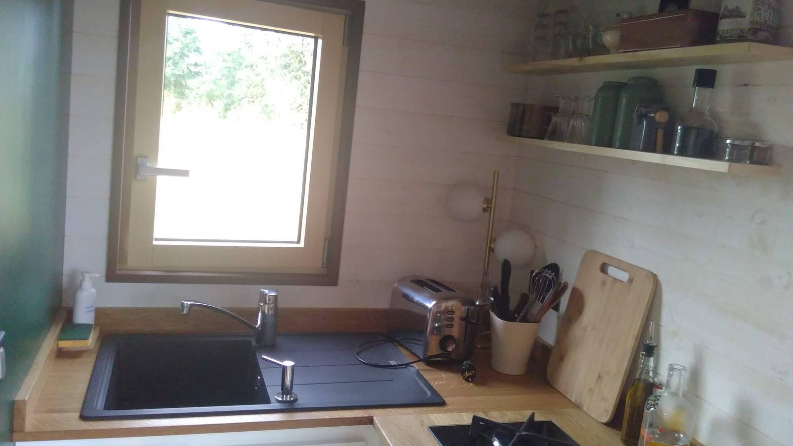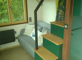 The Tiny House is equipped with a kitchen and bathroom, allowing you to remain independent. The double bedroom on the mezzanine (accessible via the stairs) can accommodate a crib on the side, and the sofa on the first floor can sleep an extra 1 or 2 people (4 in total). Please note that the comfort of the sofa does not match the luxury of the large double bed in the bedroom.