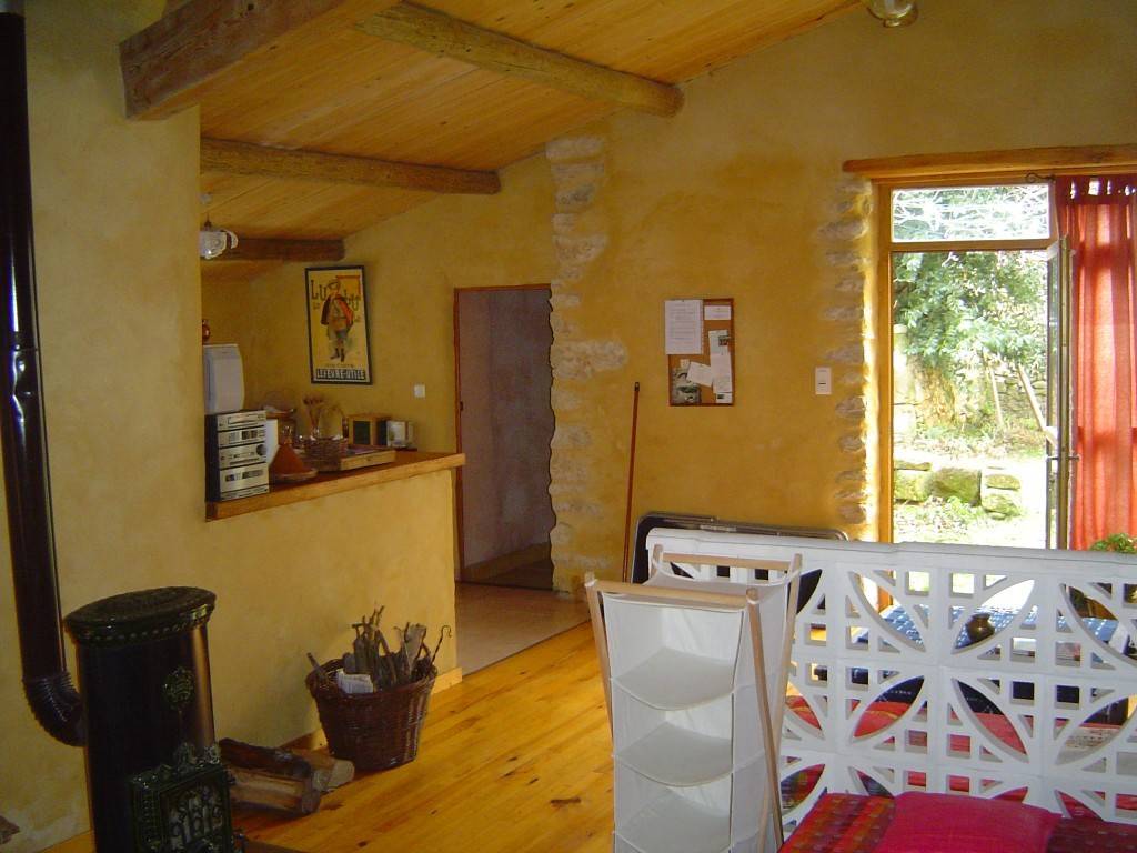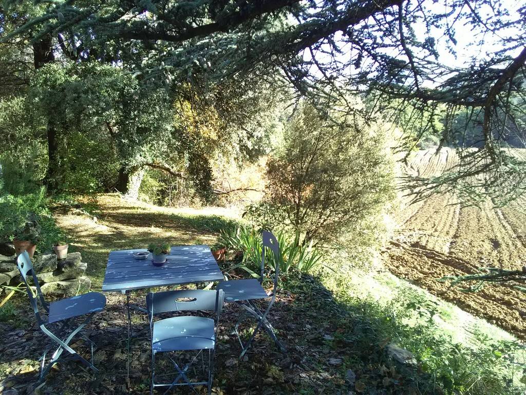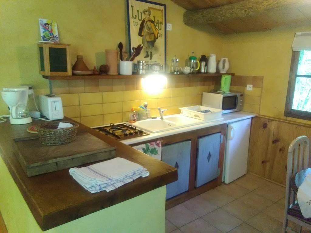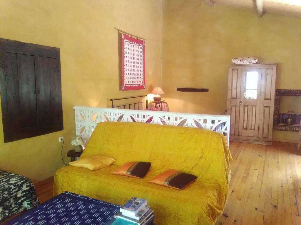 Totally independent gite. Private entrance via a dry-stone terrace. Ambiance of stone and wood. Wooden parquet flooring, ochre-yellow rendering. We've kept this space open on one level, with no partitions. A discreet screen separates the bed from the sofa. Separate bathroom. The bay window overlooks the 100 m2 garden. Ideal for 3 people.
