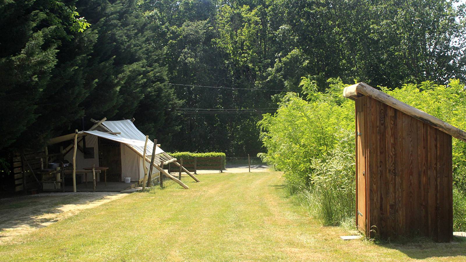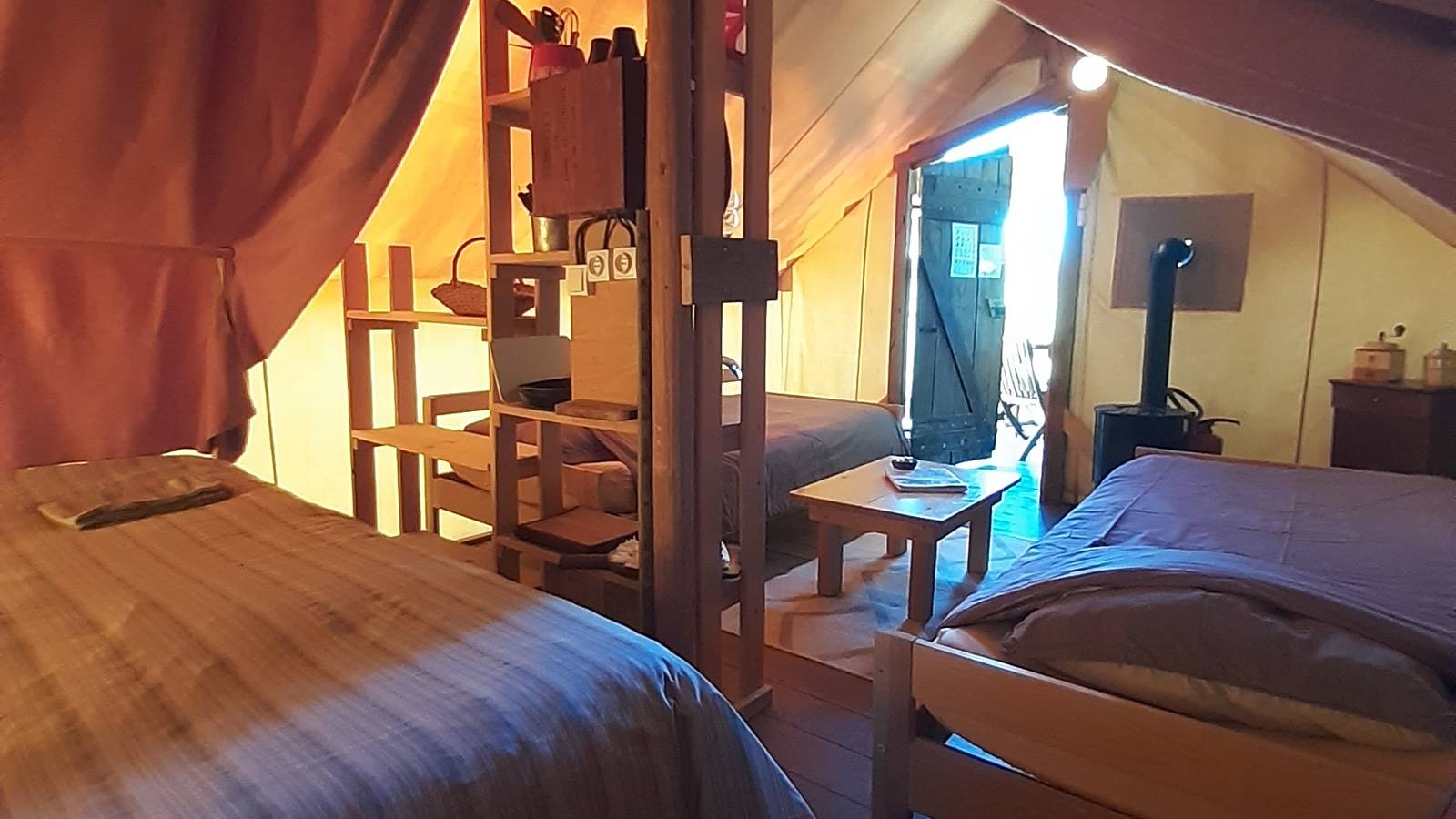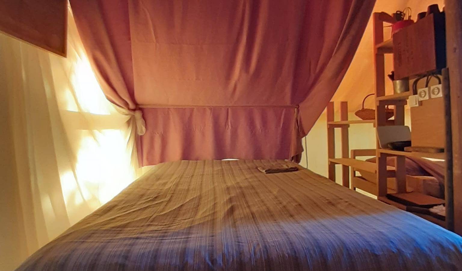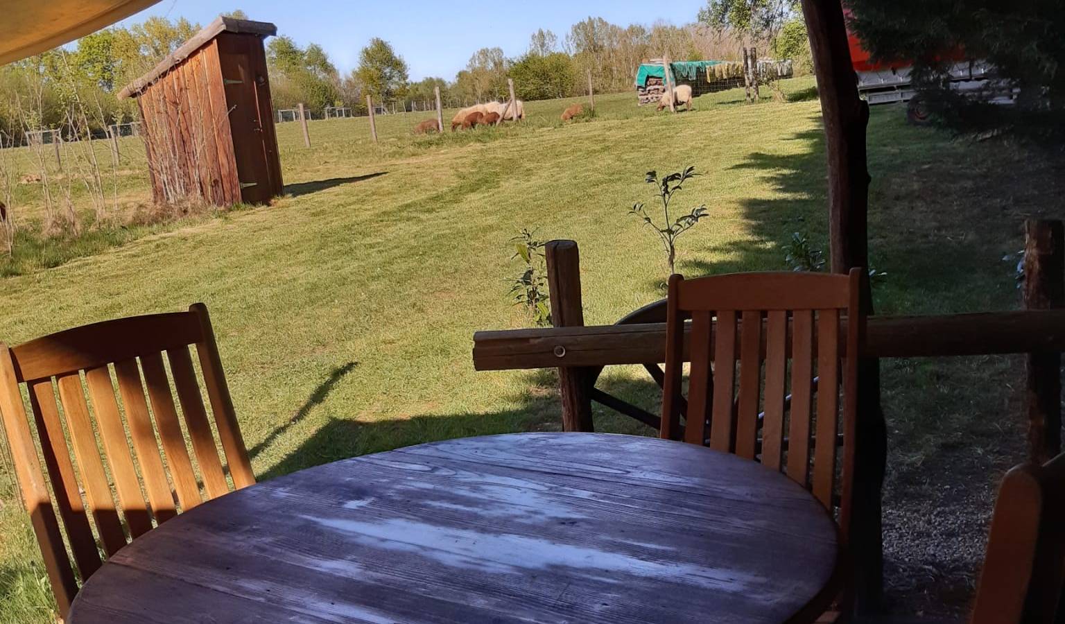 Escape under the stars, in the middle of Bresse nature, and enjoy a restful sleep at Auntie Ada's! This trapper's tent offers all the comforts of a small bungalow with a real bed, but no electricity or running water. It can accommodate up to 4 people. A wooden house will provide you with a shower and dry toilet, as well as handmade soaps from the Au jardin de la Vouivre soap factory. You'll enjoy a shaded outdoor area under a large oak tree, on the edge of the pond.