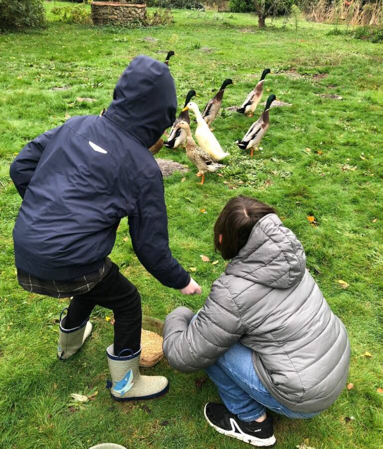 Le Pas Radis is aptly named, because when you arrive, it's like paradise! You'll find yourself in the middle of a forest of hundred-year-old trees and majestic pines, with 5000m2 of ponds, flowers of every color, a rich biodiversity (from the pond, the forest, the surrounding fields, etc.). You'll hear the birds singing, the wind blowing through the leaves, the horse neighing, the flock of ducks and their hen friends passing this way and that, and the cats curled up in a sunny corner! Here at Pas Radis, we take our time! We offer a wide range of nature-related activities, which you can find in the "Activities" tab.