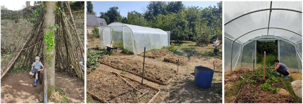 Plusieurs principes ont guidé notre façon de vivre sur ce terrain : - Favoriser la biodiversité - Préserver les ressources (toilettes sèches, phyto-épuration, rénovation à la terre/paille/pierre/bois) - Aller vers l’autonomie : sobriété, cuves de récupération d’eau de pluie, panneaux photovoltaïques, potager (50m2), arbres fruitiers (une vingtaine), petits fruits (plus de 100) et plein de plantes sauvages. Nous avons 8 poules, 2 canards, 3 lapins, 1 cochon d'inde et les portées régulières.