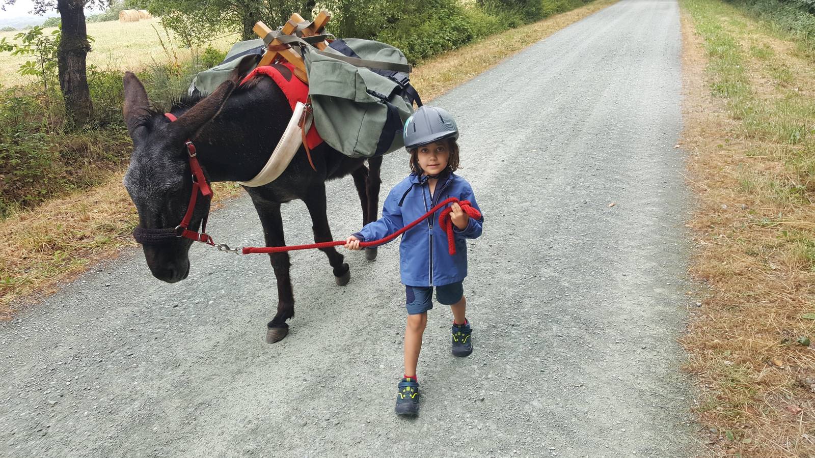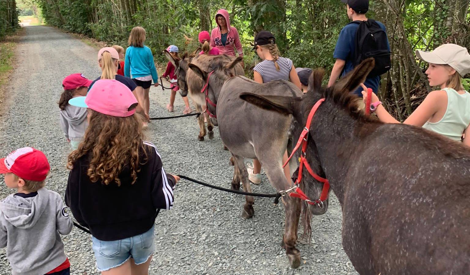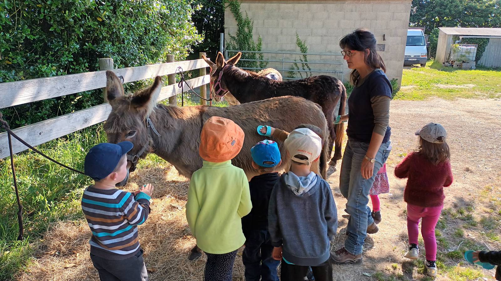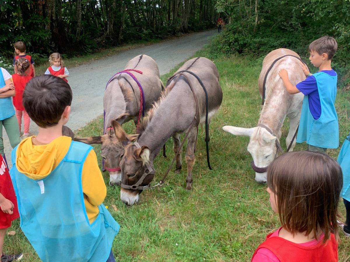 Accueil pédagogique à la journée pour les groupes d'enfants ; randonnée avec un âne ; asino-médiation