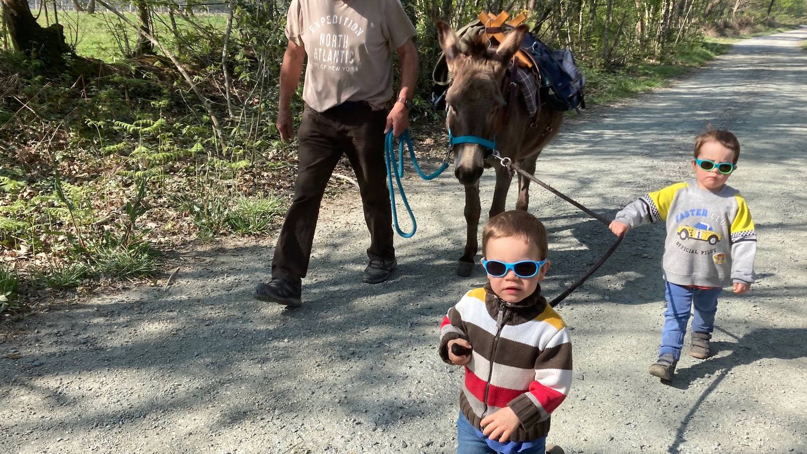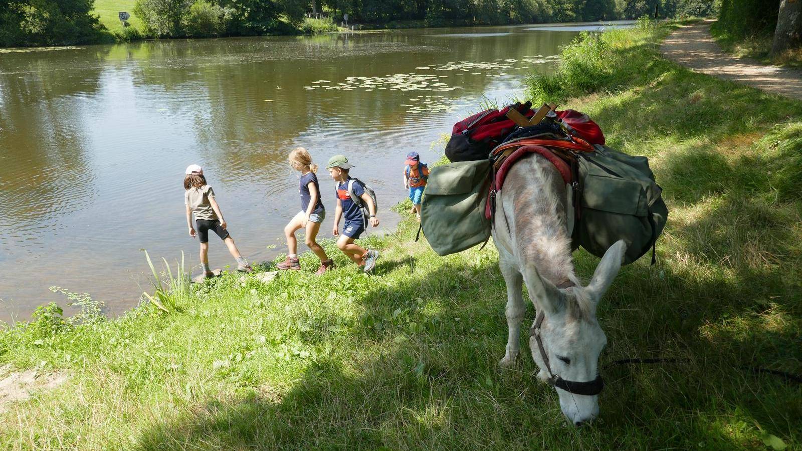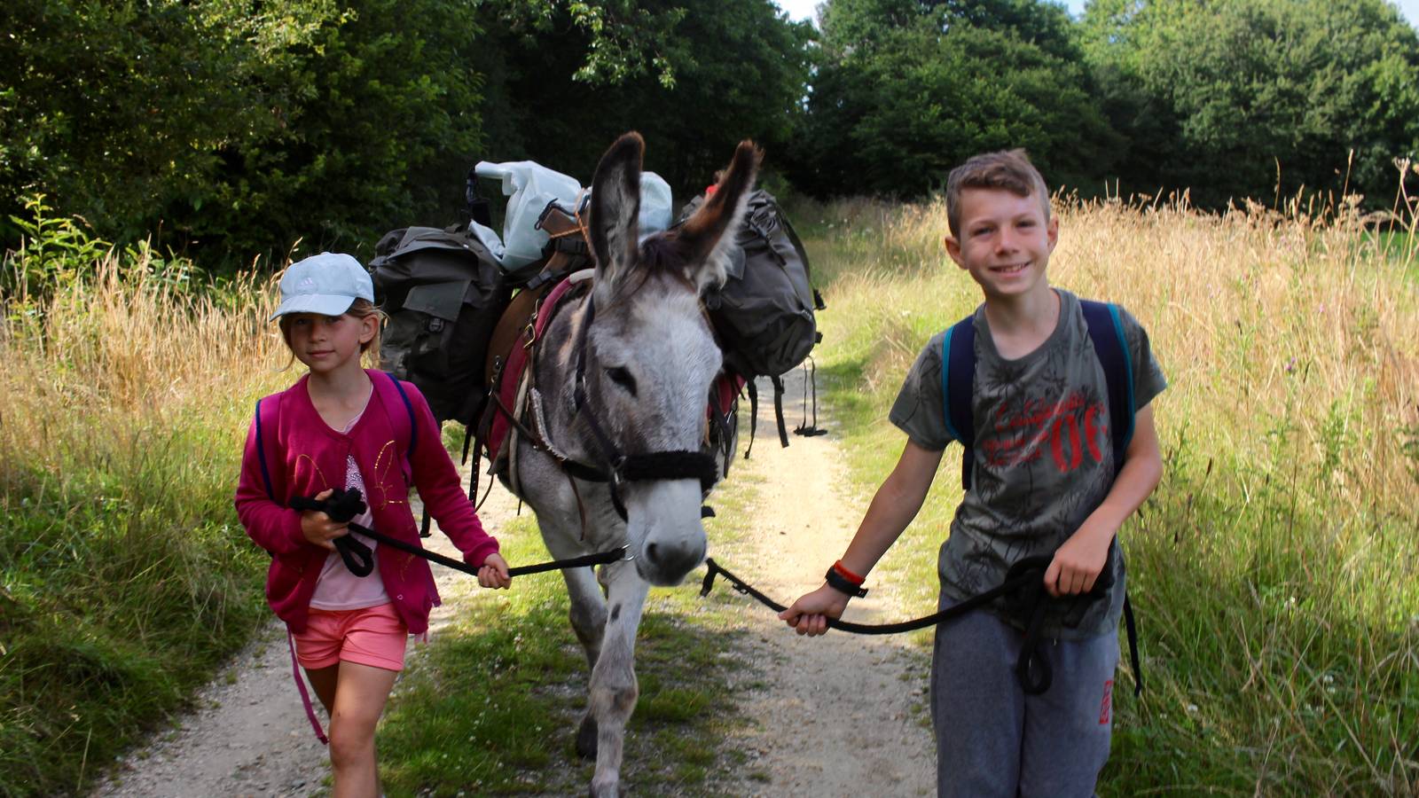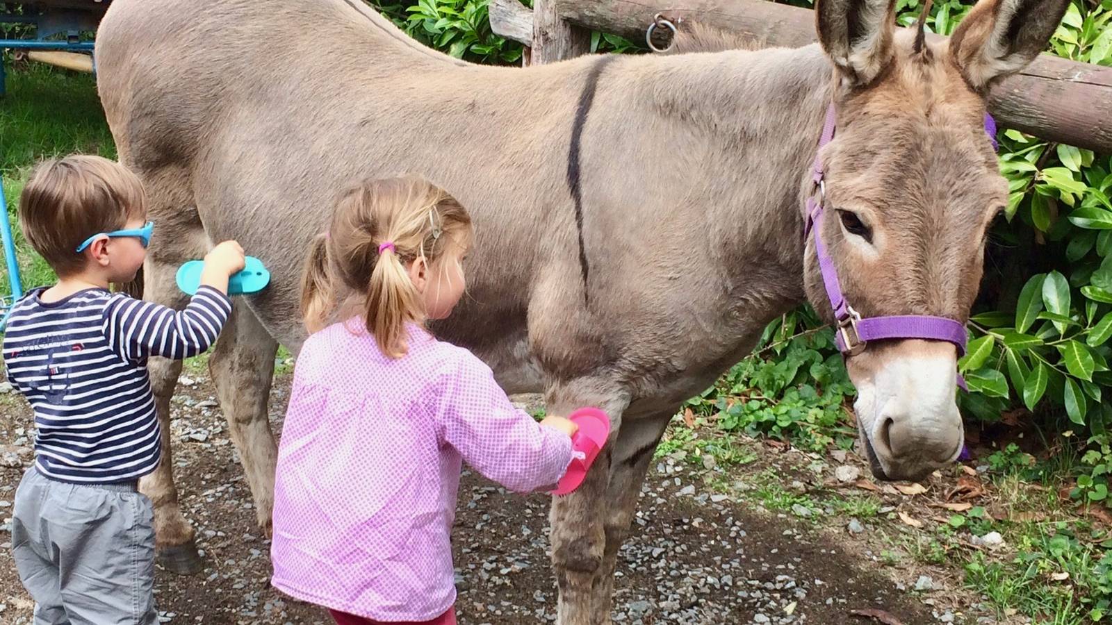 Accueil pédagogique à la journée pour les groupes d'enfants ; randonnée avec un âne ; asino-médiation