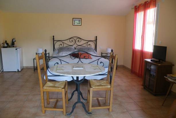 Grande chambre d'hôte pour 2 personnes, avec salle d'eau privative, équipée PMR, avec petite terrasse. Idéalement située au cœur des vignes dans le Parc Naturel Régional des Baronnies Provençales.