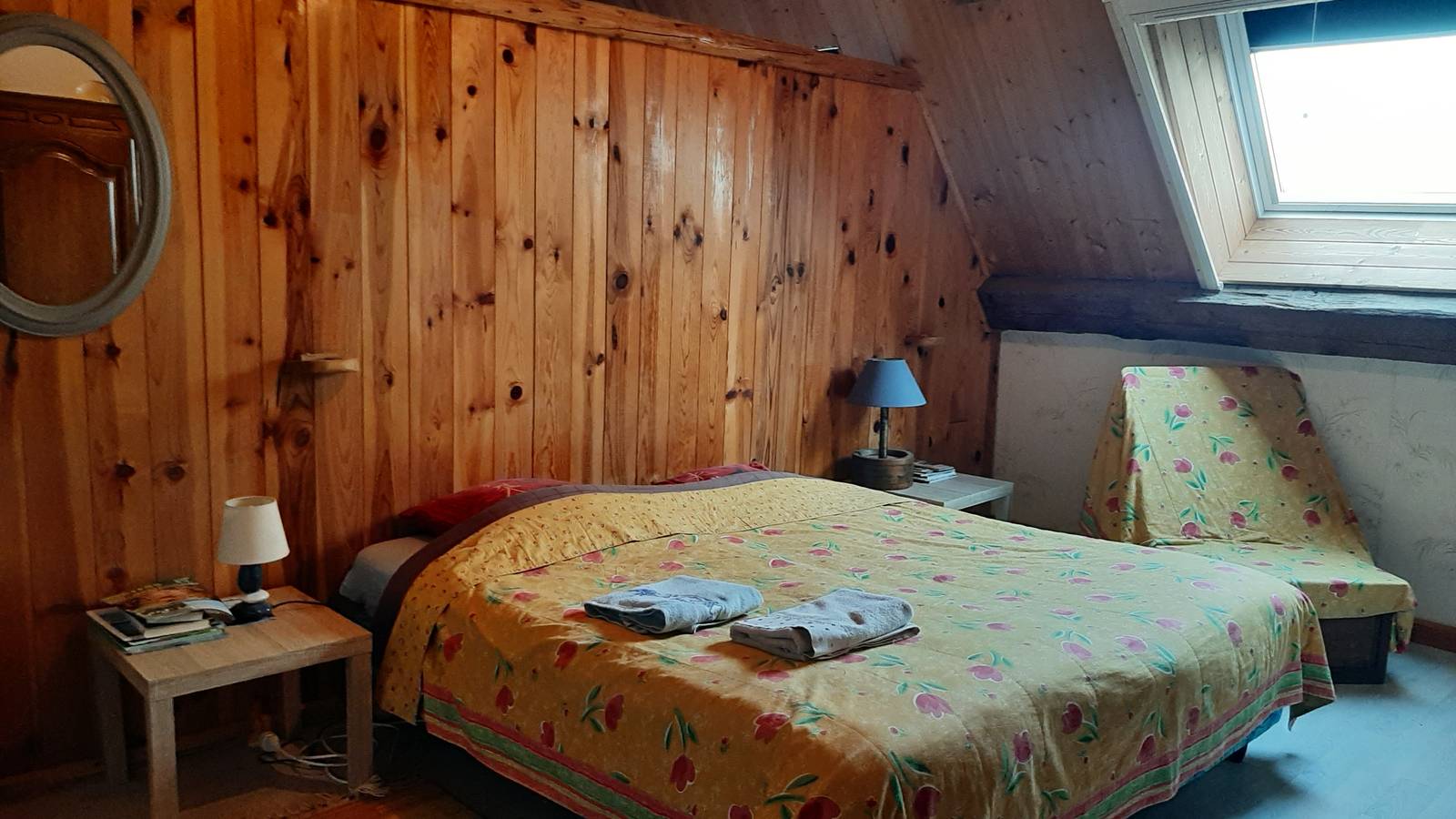 Chambre spacieuse avec lit de 180cm et 2 lits simple de 90 cm.