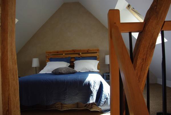 Chambre rénovée avec des matériaux locaux et écologiques : Couleur chaux et sable, la maison est chauffée avec un poêle à granulés de bois.