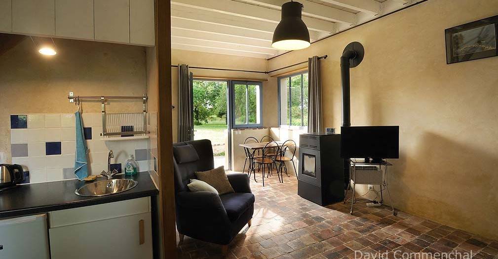 Chambre " familiale", un lit 2 personne + 1 lit enfant + 1 lit bébé en mezzanine. Un canapé-lit 2 places en rez-de-chaussée, avec une table et une kitchenette. La salle de bain avec baignoire et les wc sont en rez-de-chaussée. La terrasse donne sur le jardin. La maison est chauffée avec un poêle à granulés de bois.
