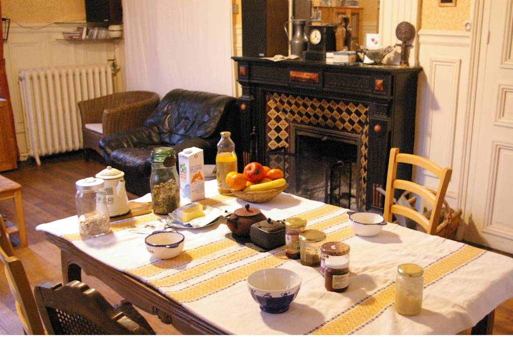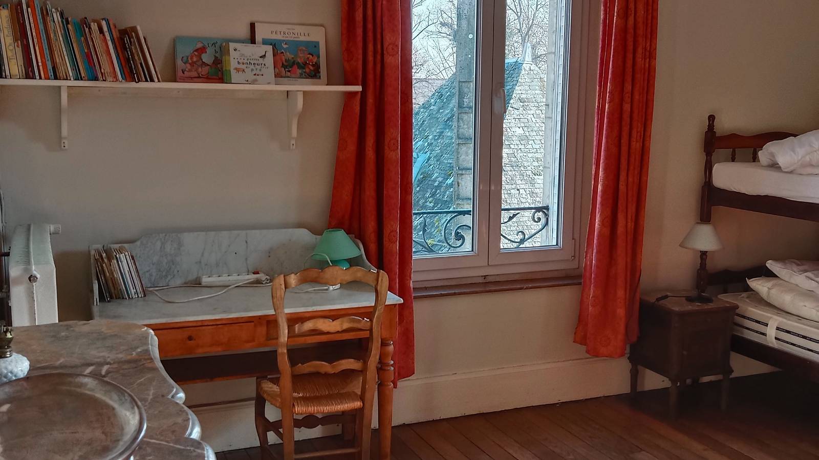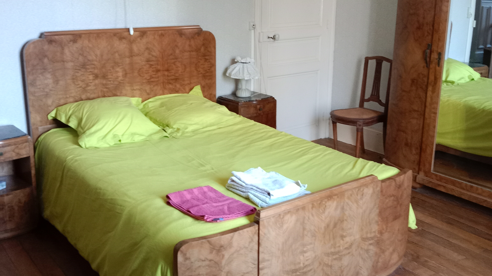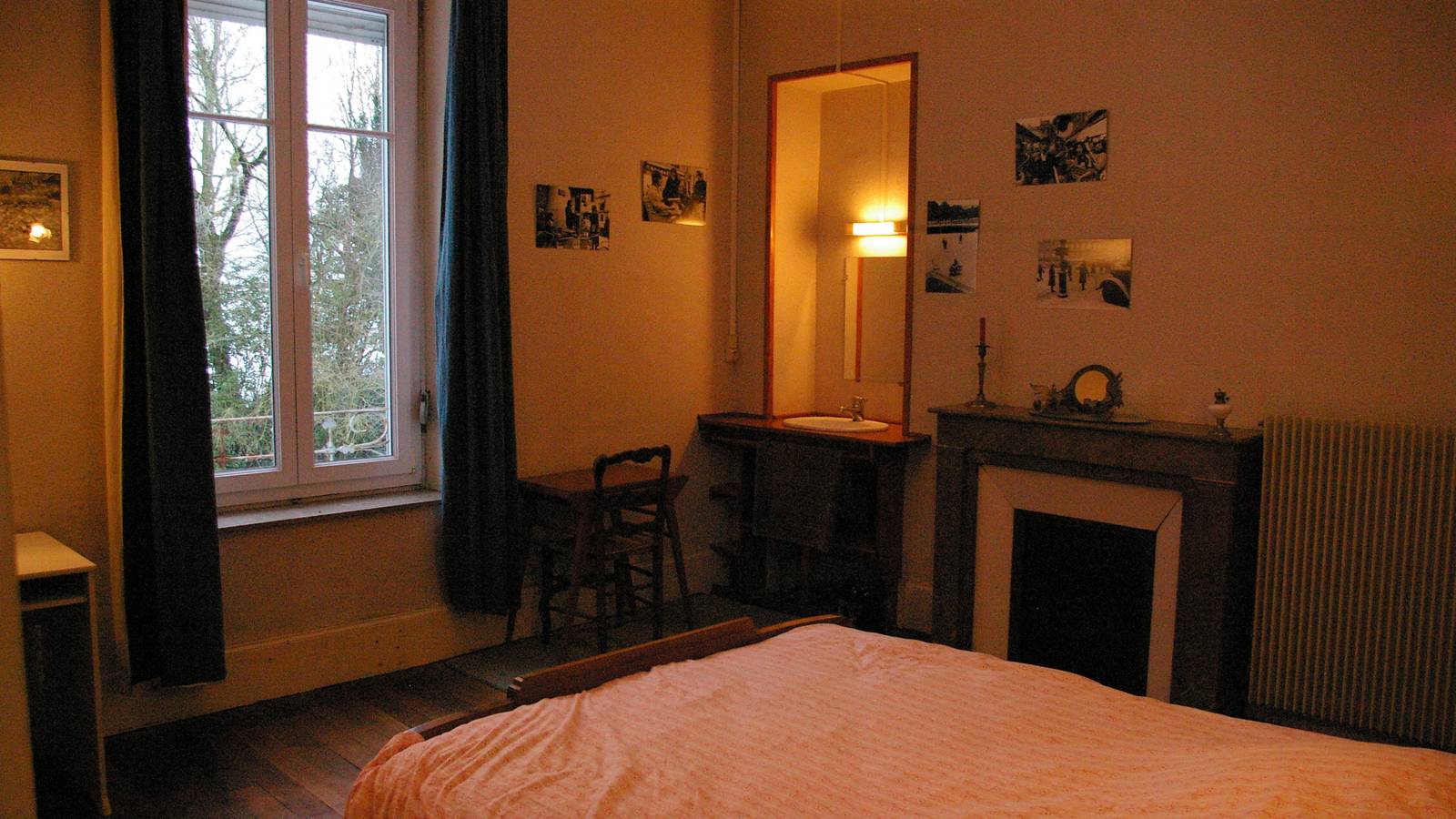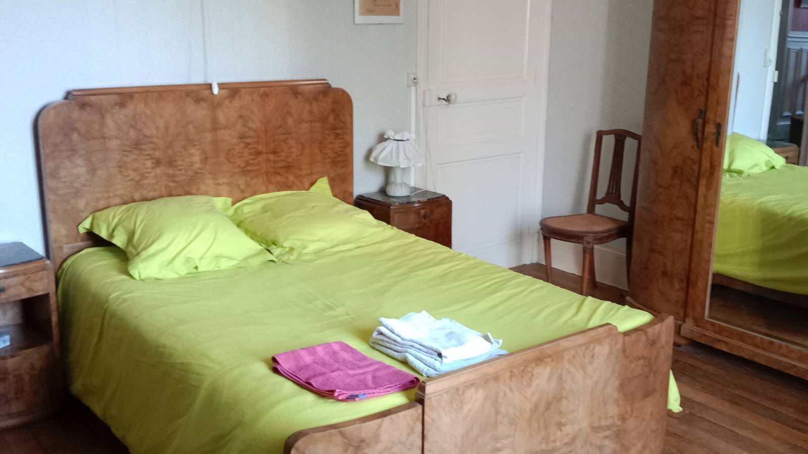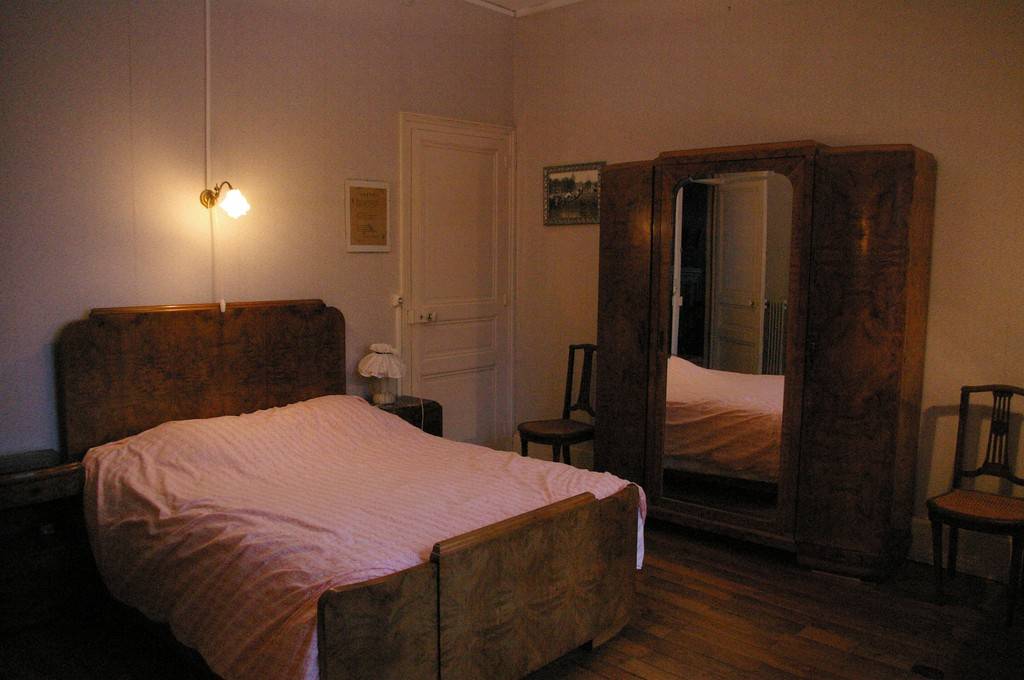 La parisienne est une chambre meublée style Art Déco en "loupe de noyer" située au premier étage de la maison, elle est équipée d'un lavabo et d'un petit bureau. Un lit une personne peut être ajouté sur demande. La fenêtre donne sur le parc, orientation Ouest. La douche et les toilettes sont accessibles du palier ainsi qu'une cuisine commune. En mode "fenêtre ouverte", vous pourrez profiter du concert des oiseaux au petit matin... et vous rendormir aussitôt pour une grasse matinée.