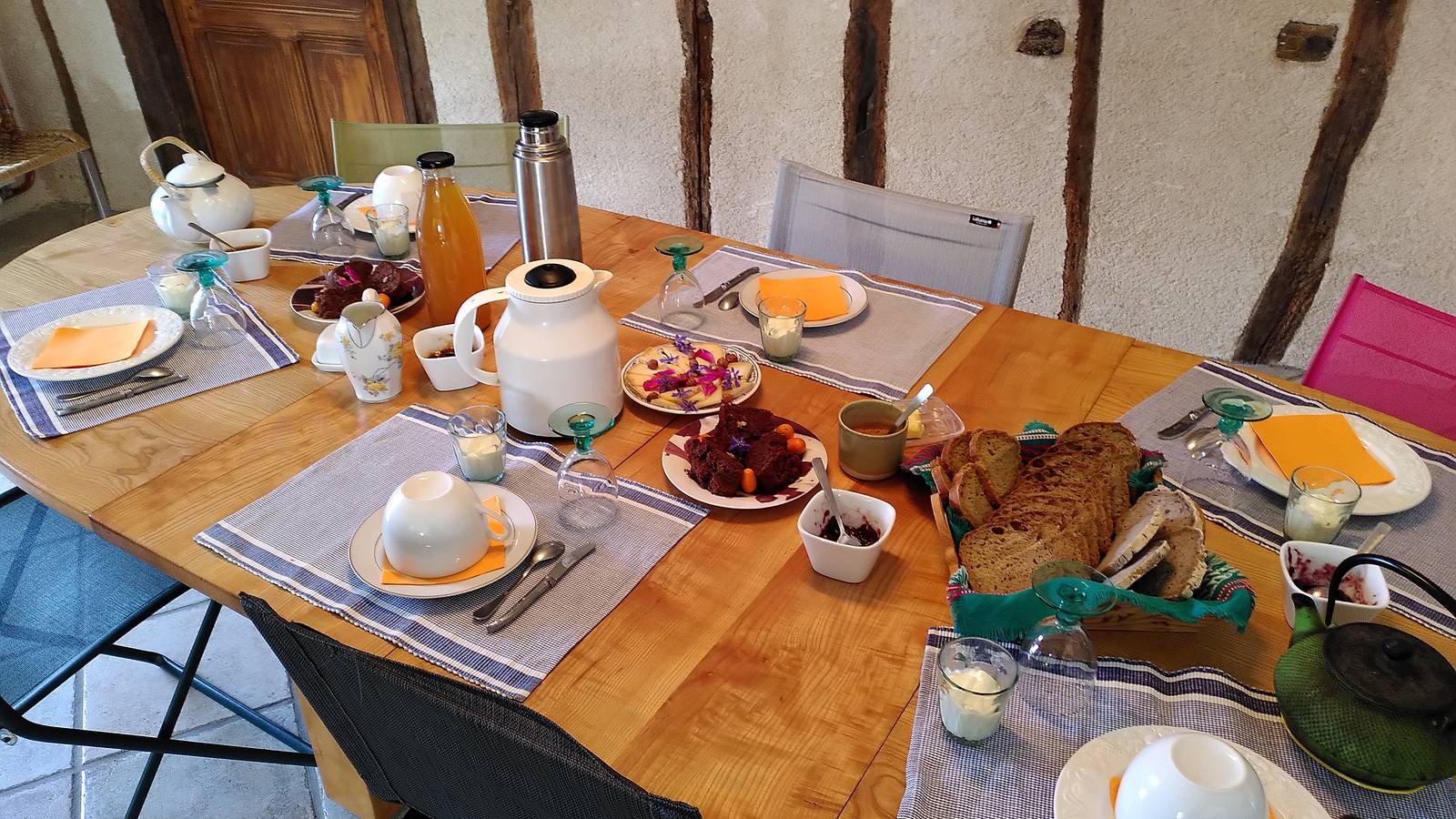 Nous vous accueillons au sein d'une ancienne ferme dans "La maison des Saisonniers" abritant 2 chambres d'hôtes à l'étage (toutes saisons, chaudière à granulés), sanitaires privatifs. Les meubles proviennent surtout de brocantes, produits ménagers écologiques, électricité d'énergies renouvelables. Une grande cuisine d'extérieur à disposition, un jardin de 1000m2 très fleuri avec sa mare; légumes, plantes, fruits de notre potager (500m2 de culture en bio) et oeufs de nos poules, vous seront servis suivant les récoltes, transformés ou pas. Les produits de nos tables seront bio ou locaux, favorisant les petits producteurs de proximité.