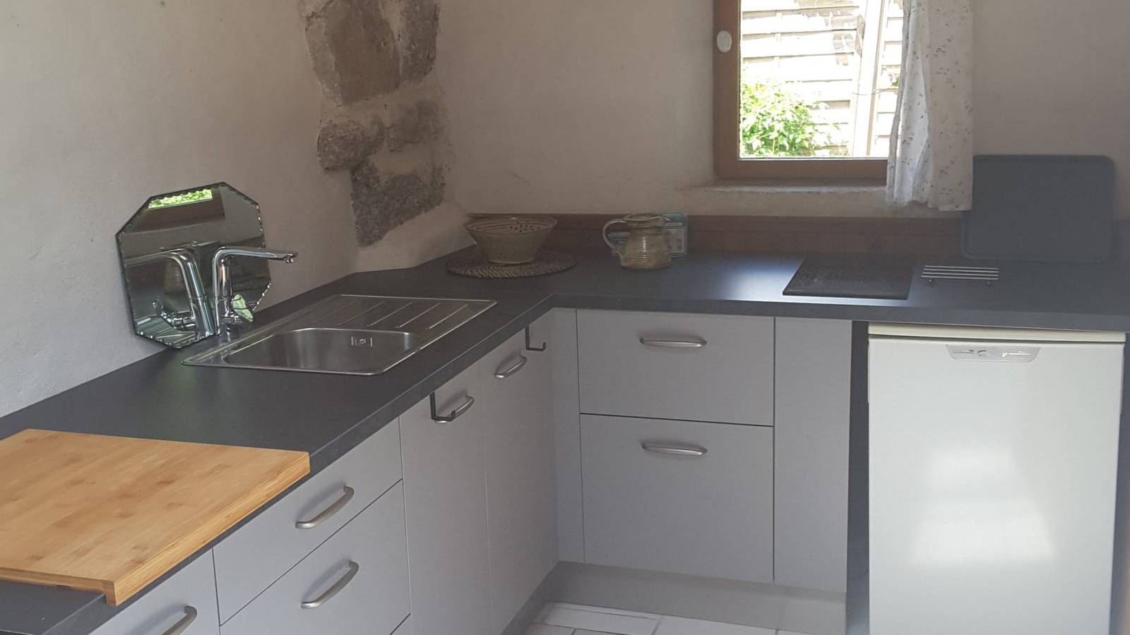 Petite cuisine équipée (plaque cuisson, frigo, évier, micro onde, bouilloire, cafetière, vaisselle)