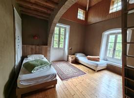Gîte en pleine nature, lumineux et confortable jusqu'à 12 places. La maison ancienne en pierre offre de la fraicheur en journée l'été. Les grands arbres avoisinant donnent une ombre agréable. Le gîte dispose de 4 chambres dont une chambre avec salle de bain privative et 3 chambres avec salles de bains communes et un dortoir de 4 lits. Possibilité de jumeler les lits 90cm en lit double.