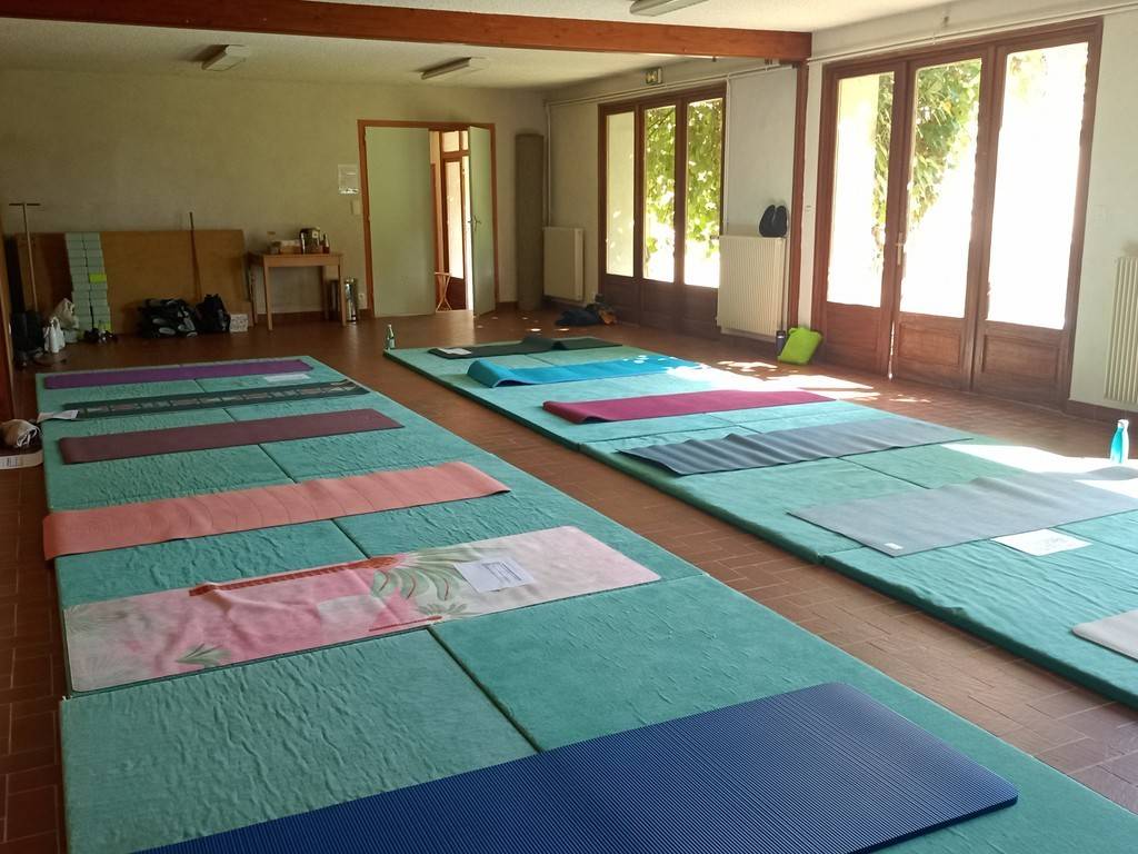 Nous disposons également d'une grande salle (70m²) qui peut être utilisée comme salle de réunion (tables et chaises) ou salle de pratiques bien-être (tatamis).