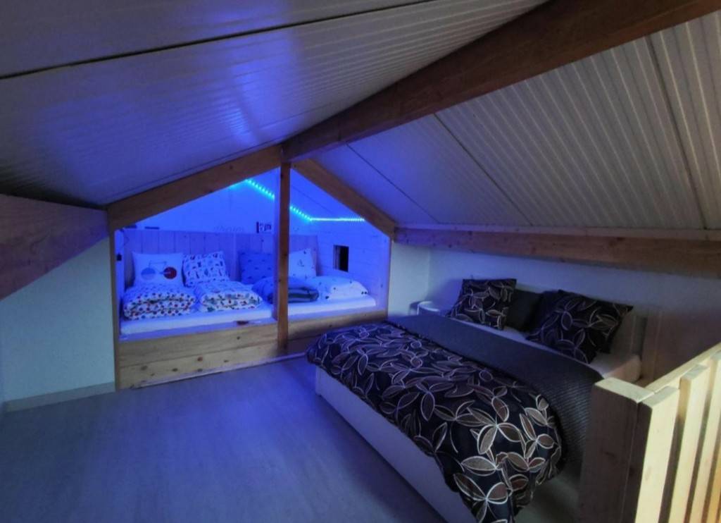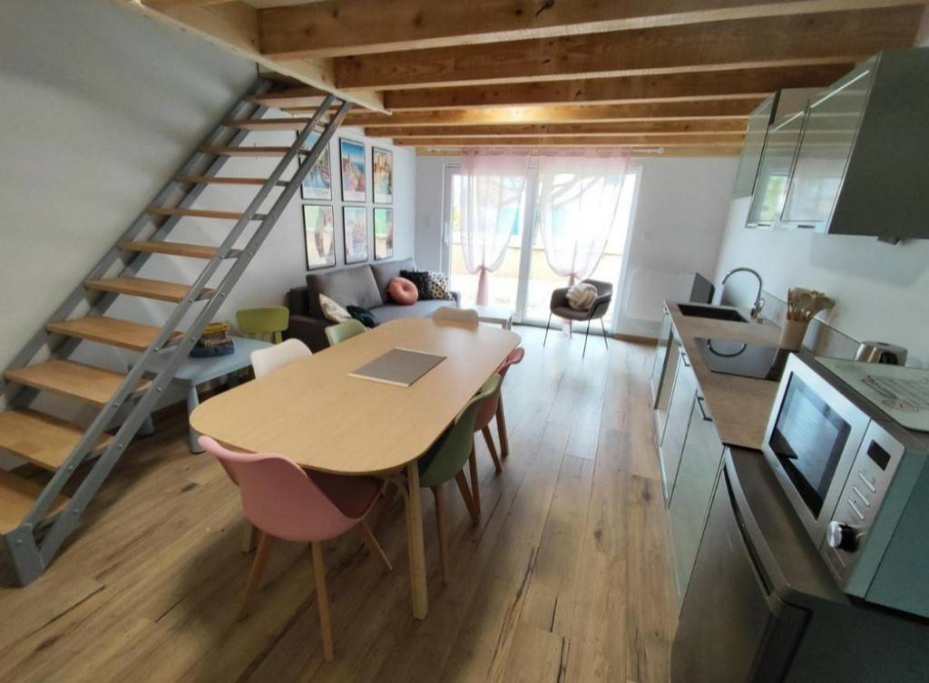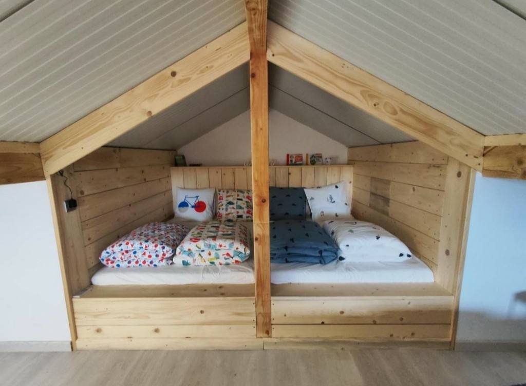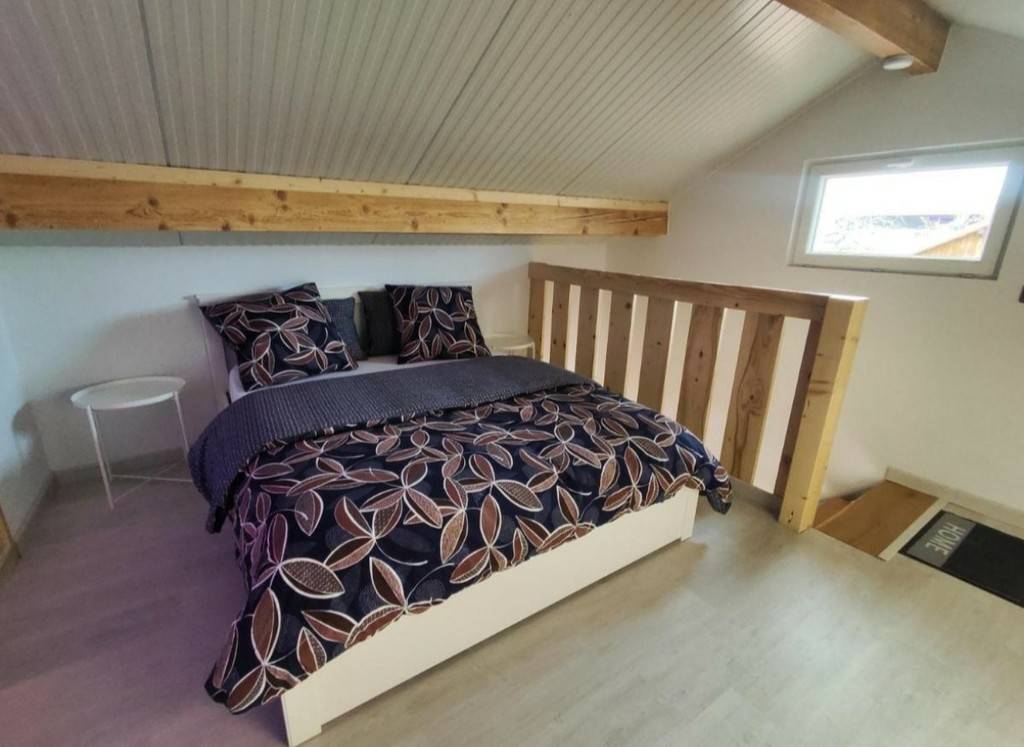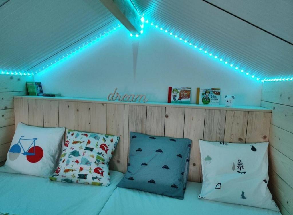 Logement cosy, paisible et chaleureux. Le gîte est composé au rez-de-chaussée d'une pièce à vivre avec cuisine, salle à manger et salon avec canapé-lit confortable. Une salle de bain avec douche à l'italienne. Au premier étage, il y a une mezzanine avec un lit parental de 160cm et un gigantesque lit-cabane de 2 lits 140cm (pour 4 enfants ou 2 adultes). La mezzanine avec la cabane va combler de bonheur les enfants.