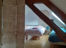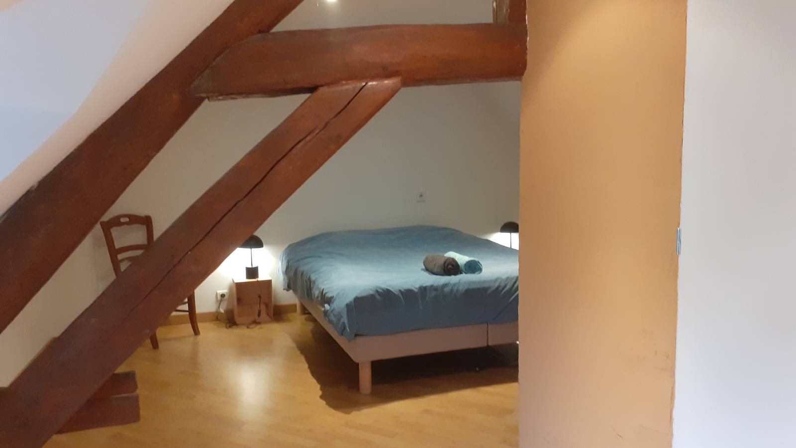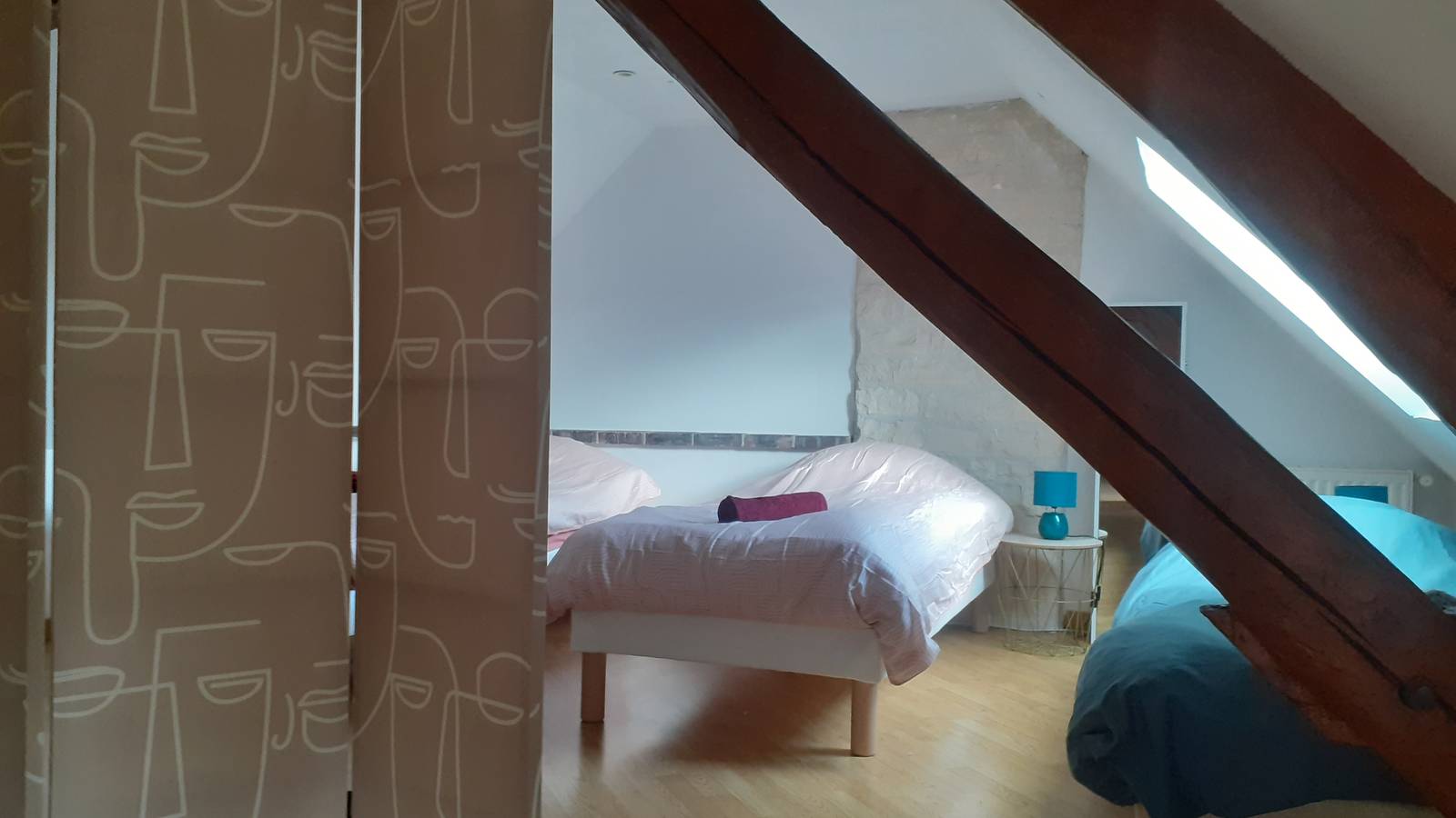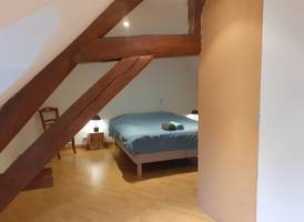 A l'étage il y a une grand pièce avec deux chambres qui ne sont pas séparées par une cloison, mais uniquement par un paravent. La salle de bain a été rénovée en 2023, elle se trouve entre les deux chambres. Les lits peuvent être disposés en lits doubles ou lits simples.