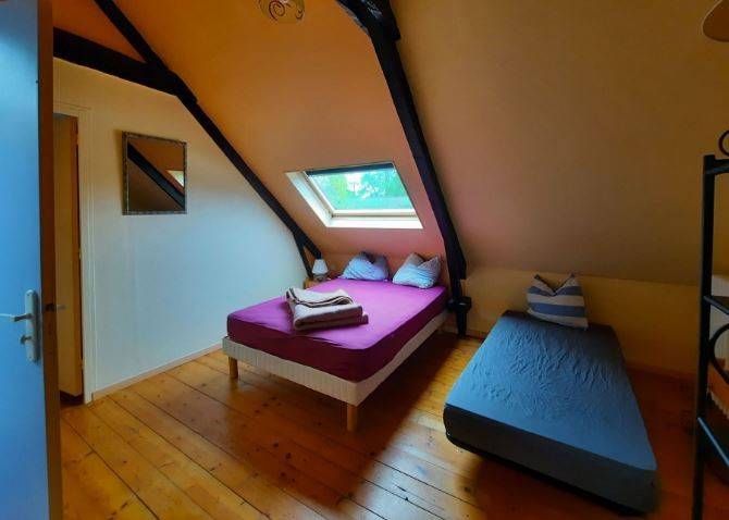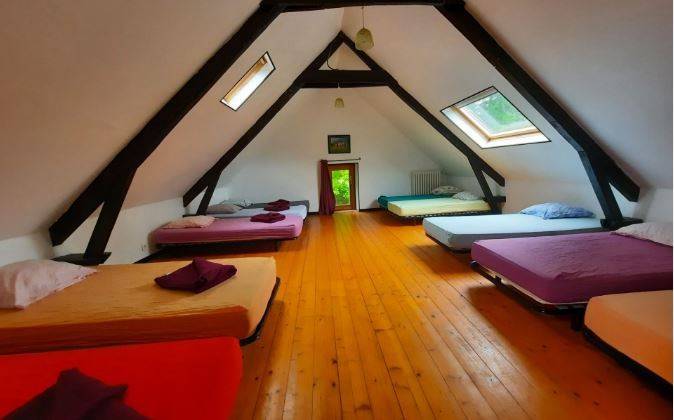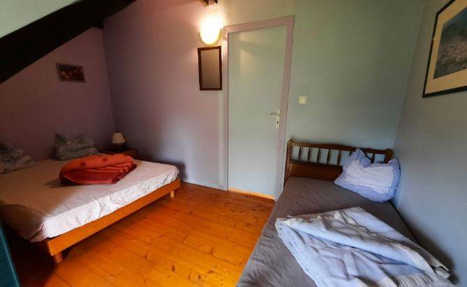 2 chambres (3 et 4 personnes) avec sdb et WC privés et 1 dortoir de 12 lits dans une longère du XVe siècle. Grande salle commune avec cuisine équipée en libre service. Magnifique cheminée dans le coin salon.
