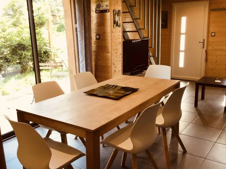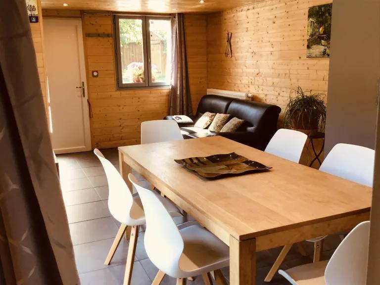 Gîte familial avec salon et cuisine équipée, deux chambres pouvant recevoir jusqu'à 6 ou 7 personnes, salle de bain avec douche balnéo et terrasse.