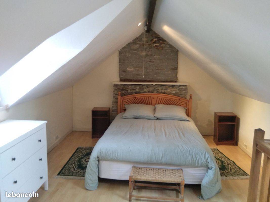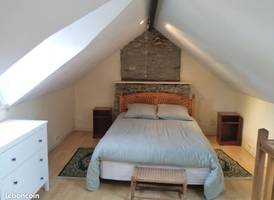 à l'étage la chambre est mansardée, il y a un lit 2 personnes (140/ 190), un lit une personne (90/190), une petite commode et un petit placard (ou sont rangé l'étandoire, la table et le fer a repasser, un ventilateur).