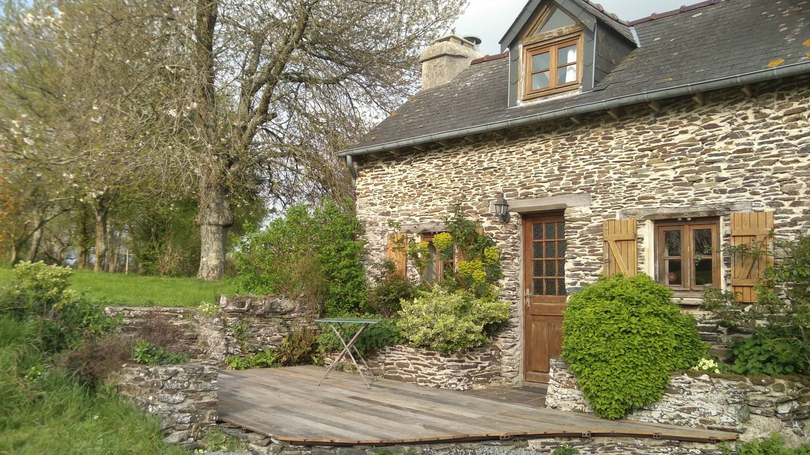 à l'entrée de la maison une petite terrasse en bois reçoit le soleil de l'après midi, à l'arrière de la maisonnette une petite terrasse en pierre reçoit le soleil du matin.