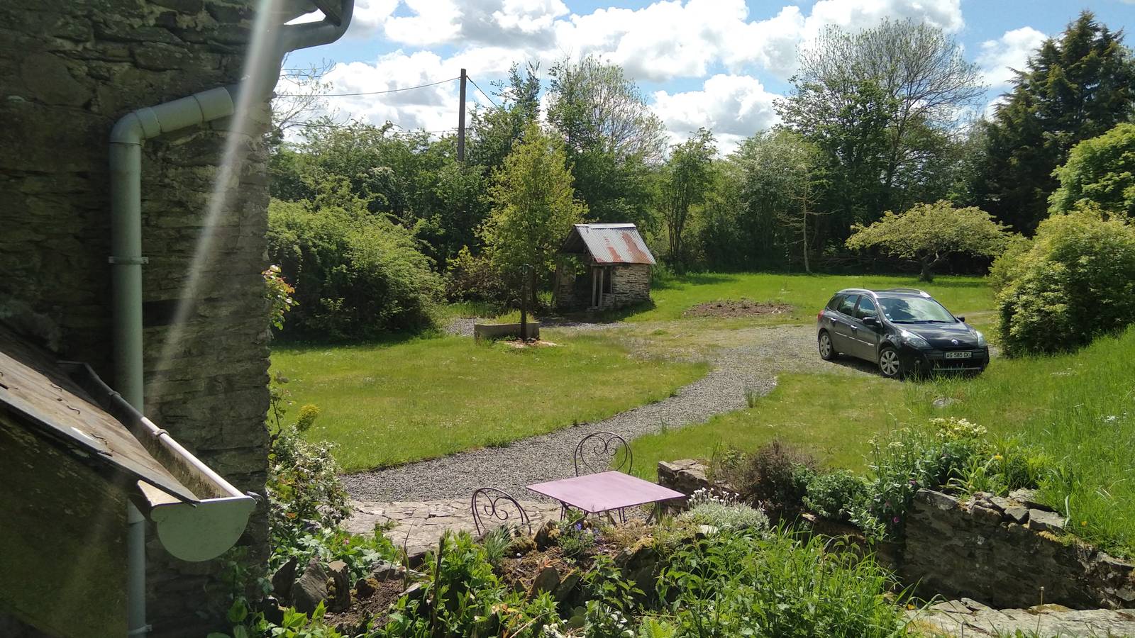 le jardin est remplis de fruitiers et de fleurs, bordé de champs où vous apercevrez peut être nos vaches. Un sentier chemin creux borde la propriété au niveau de l'entrée mais il est peu fréquenté