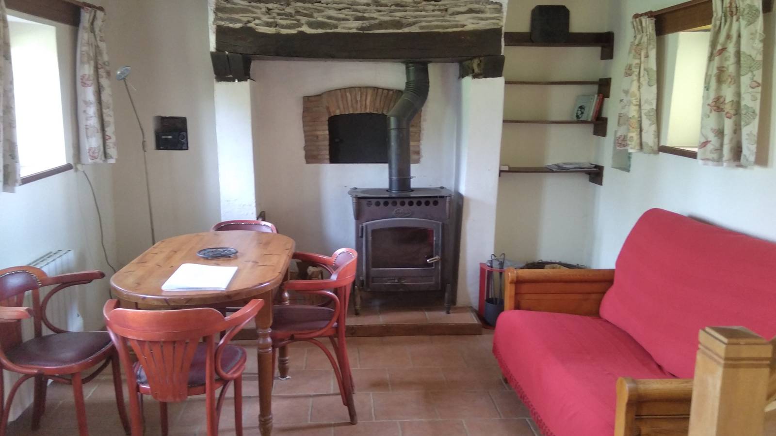 la pièce principale comporte une partie avec table a manger, petit canapé et poêle a bois d'un coté,