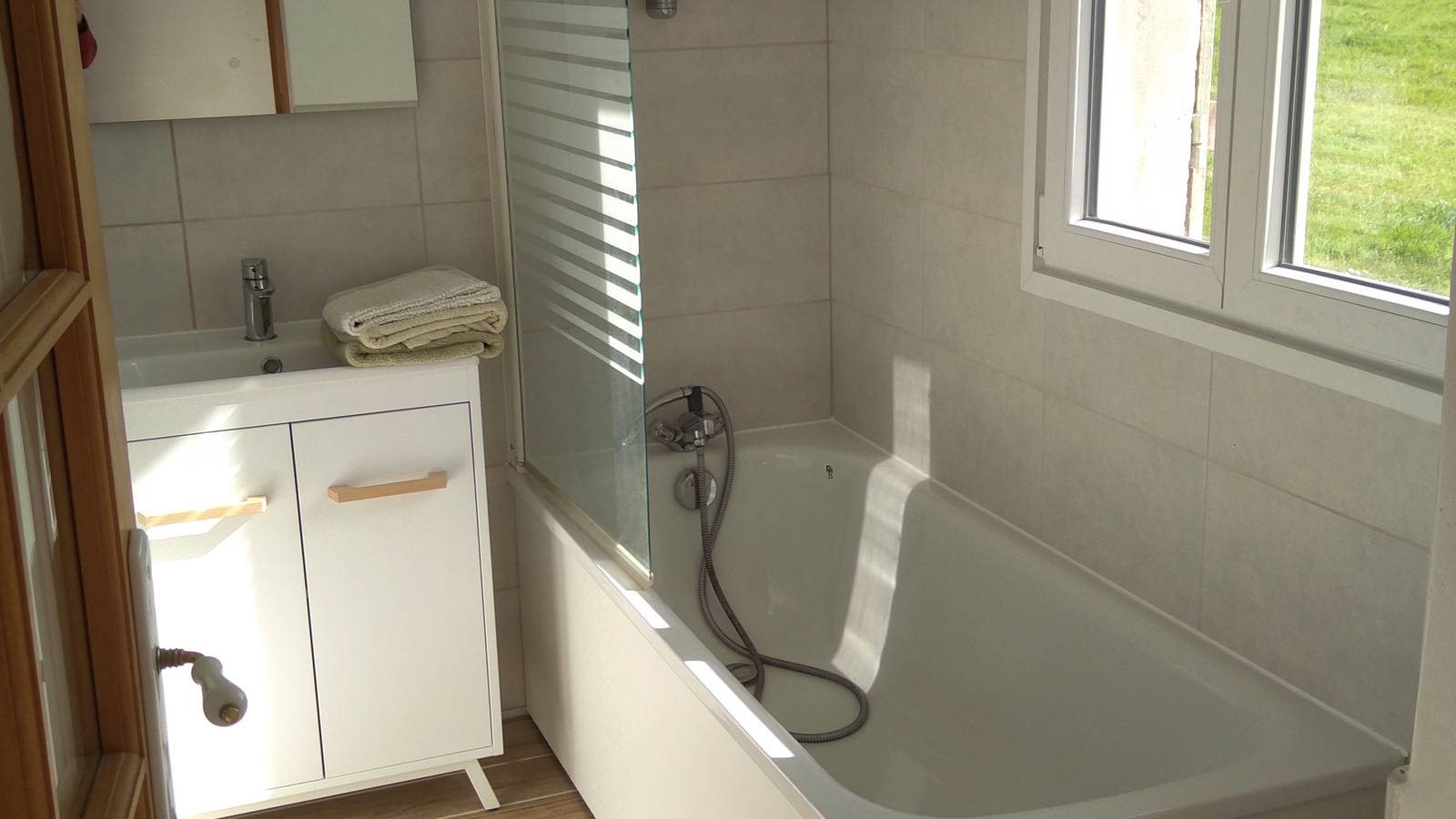 la salle d'eau est au rez de chaussé et comporte une baignoire, un toilette, un lavabo et un sèche serviettes.
