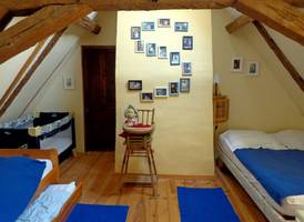 Au premier étage de notre ferme périgourdine, cet appartement plein de charme offre une vue paisible sur la petite vallée et les cultures alentour. La pièce de vie sous les toits, baignée de lumière, où les poutres apparentes et les matériaux naturels offre une ambiance douce et authentique des maisons de campagne d’autrefois. Cette pièce réunit la cuisine, la salle à manger et un coin détente où chacun trouve sa place. Les familles y apprécieront autant les moments autour de la table que les jeux d’enfants ou la quiétude d’une sieste. Les deux chambres, confortables et généreusement aménagées, offrent un repos serein, que l’on vienne en couple, en famille ou entre amis.
