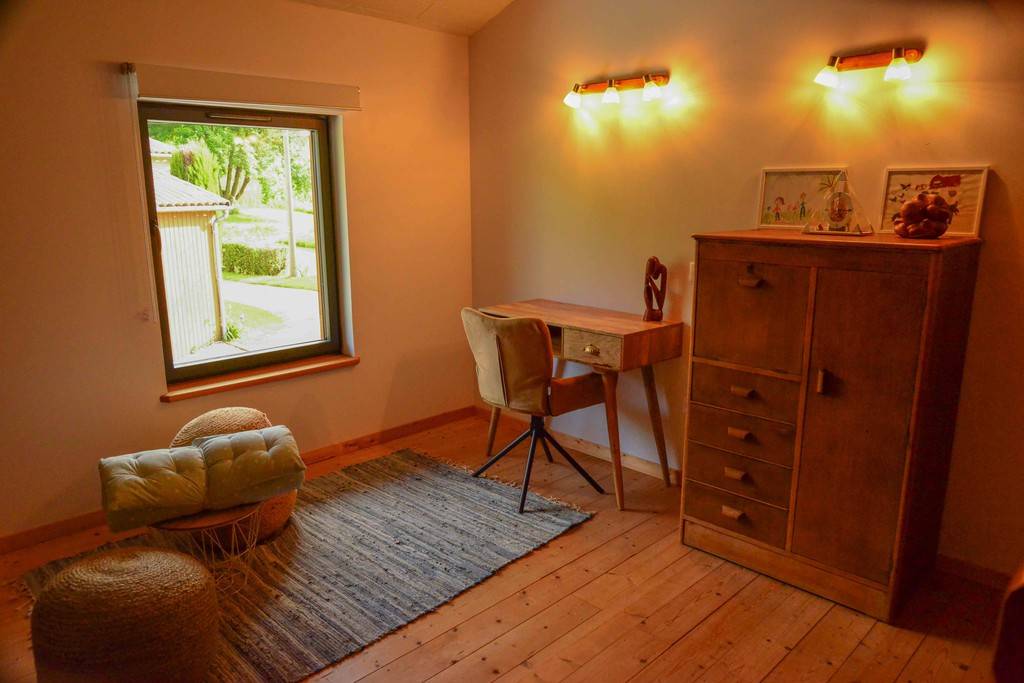 Du point de vue du lieu, une terrasse en bois couverte donne sur le jardin et la piscine de 17*4m. Elle est équipée d'une table et de chaises en teck et d'un vélo d'entrainement. Pour la piscine, il y a différents jeux d'eau pour enfant, deux chaises longues en teck et un grand parasol. La pièce principale de plein pied est composée d'une cuisine ouverte toute équipée, d'un coin salon et salle à manger, buanderie et toilettes. Le confort thermique est assuré par une excellente isolation en matériaux naturels, un poêle à bois et un chauffage mural électrique en cas de besoin. L'étage comporte l'espace nuit avec deux chambres, une salle d'eau et toilettes et un espace de jeu / bureau. Des livres, jeux et cartes et itinéraires dans la région sont mis à disposition.