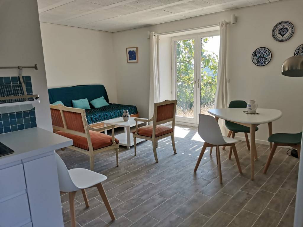 Gîte d'une chambre double et un couchage dans le salon. Vue sur le jardin et au Sud. Espace extérieur. 3 personnes max.