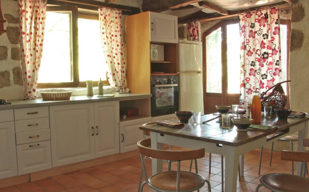 1 cuisine équipée/salle à manger (plaque de cuisson, frigo, évier, lave vaisselle, four, bouilloire, cafetière, vaisselle)