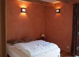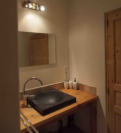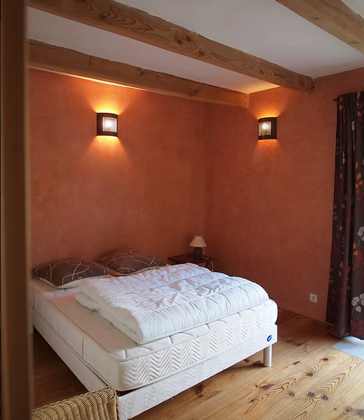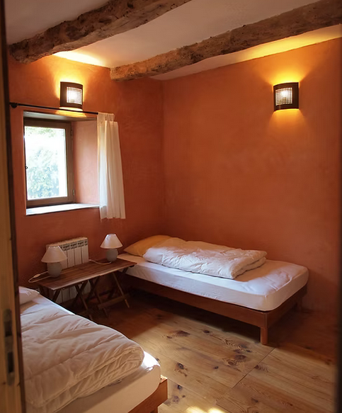 Ce lieu habité par les chèvres jusqu'en 2008 a été transformé en gîte également par notre père avec des matériaux nobles et écologiques (bois, pierre, laine de bois, chanvre, chaux). Les volumes originaux, ainsi que les ouvertures et la charpente, ont été conservés source d'un ambiance intérieure originale et apaisante. Les murs des chambres sont réalisés en enduit de chaux de type stuc.