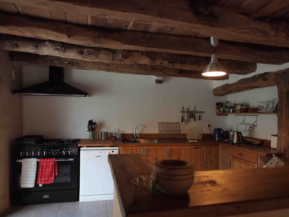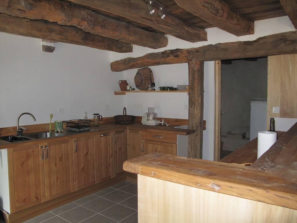 - une grande salle avec coin cuisine (équipée d'une cuisinière à gaz type piano, d'un lave-vaisselle, cafetière électrique et tout le nécessaire de cuisine),