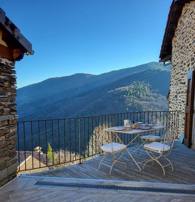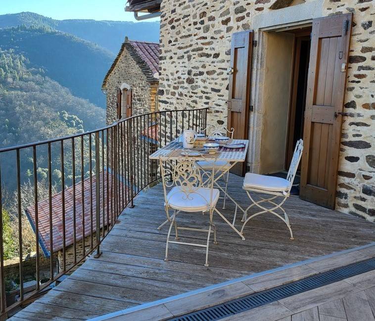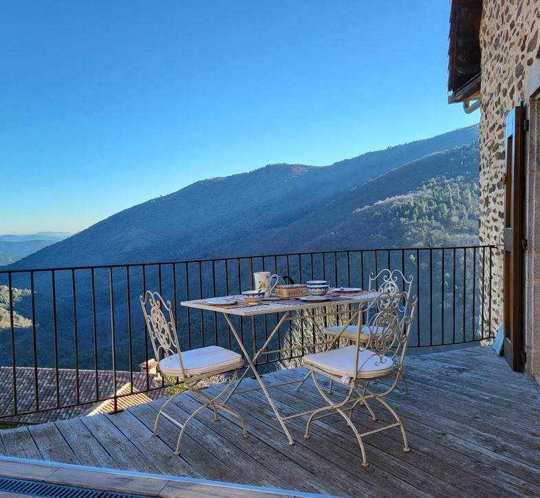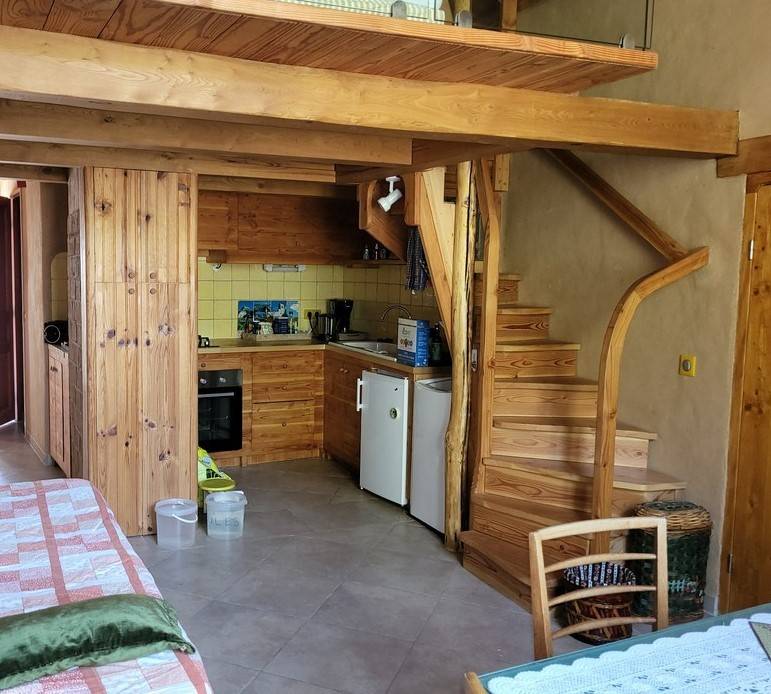 L'ancienne "grange" a une belle charpente, une terrasse originale en bois et carrelages à l'Est, avec vue plongeante sur la vallée de la rivière Ganière et l'Ardèche proche, 1 coin cuisine et 2 lits séparés dans la grande pièce, 1 salle d'eau, 1 WC séparés, 1 mezzanine avec 2 lits jumeaux (1.80 au plus haut). Vous avez accès au jardin des plantes (en pots) pour manger à l'abri du soleil ou du vent, par la terrasse qui donne sur le gîte. Sur la terrasse, une table , des chaises, des chaises longues .