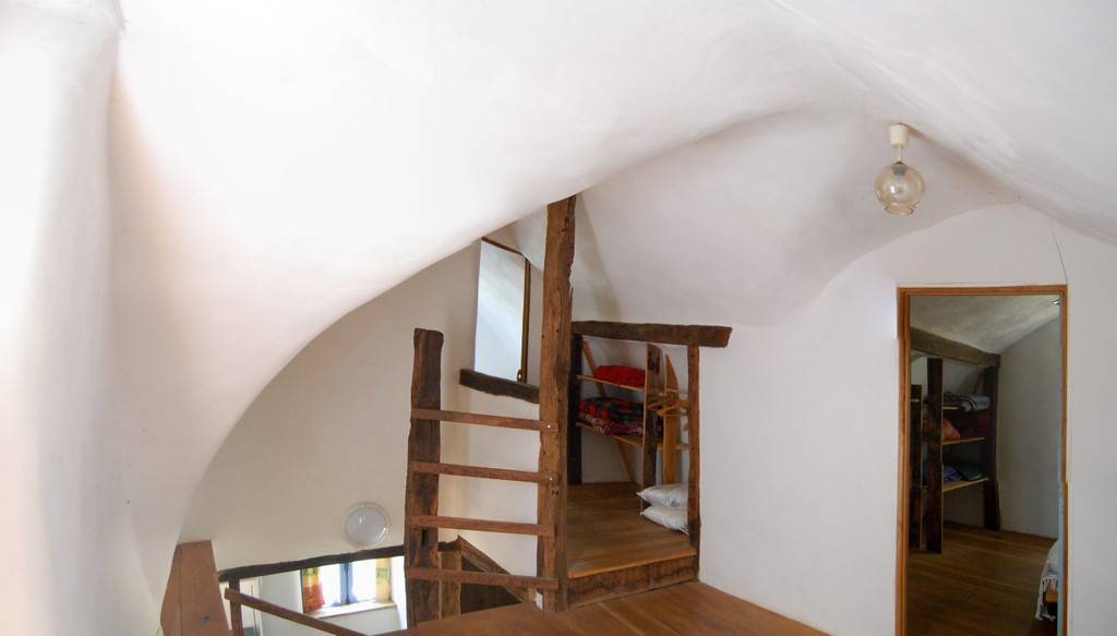 Construit sans béton, en paille porteuse pour le rez-de-chaussée et surmonté d’une voûte de paille enduite de terre intérieur et extérieur (finition plâtre). L’intérieur est fait de boiseries anciennes.