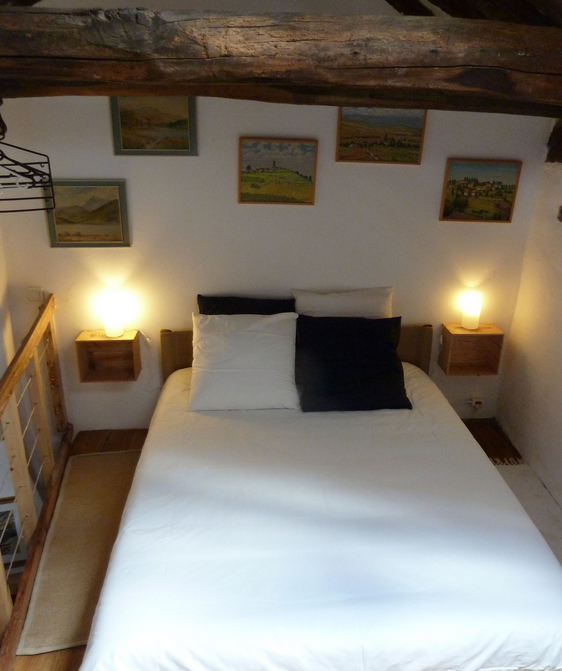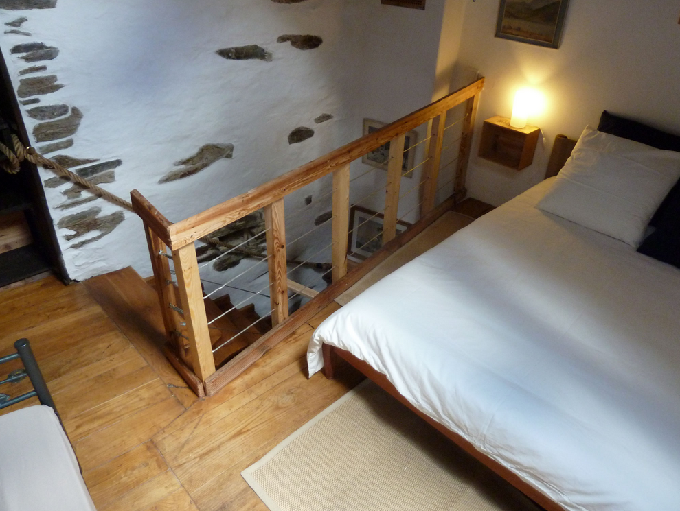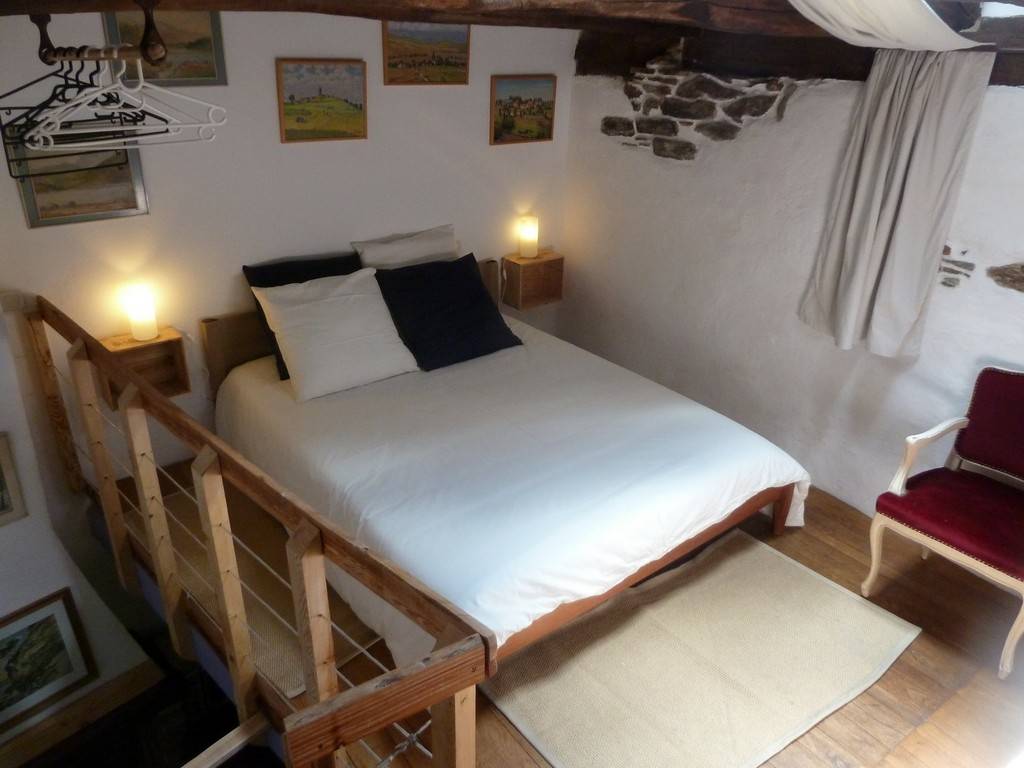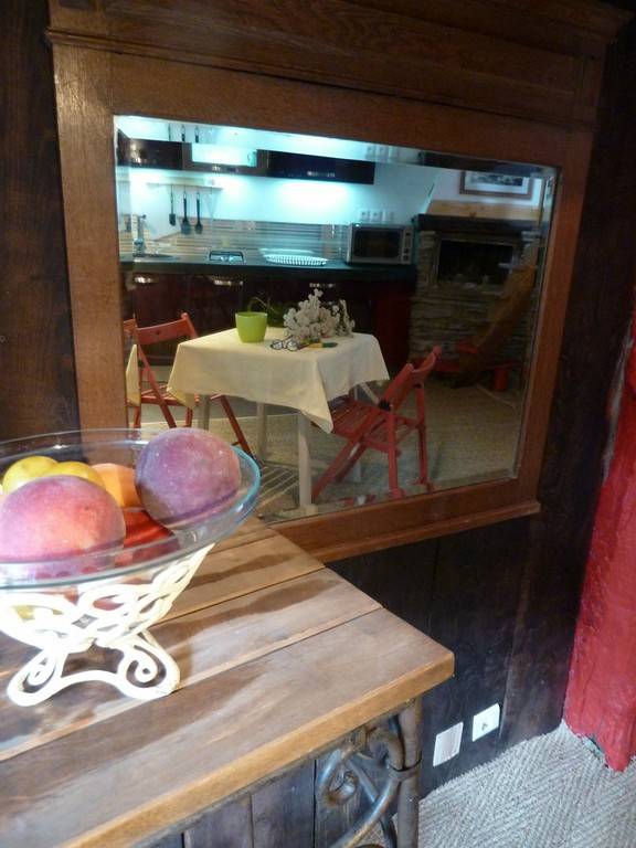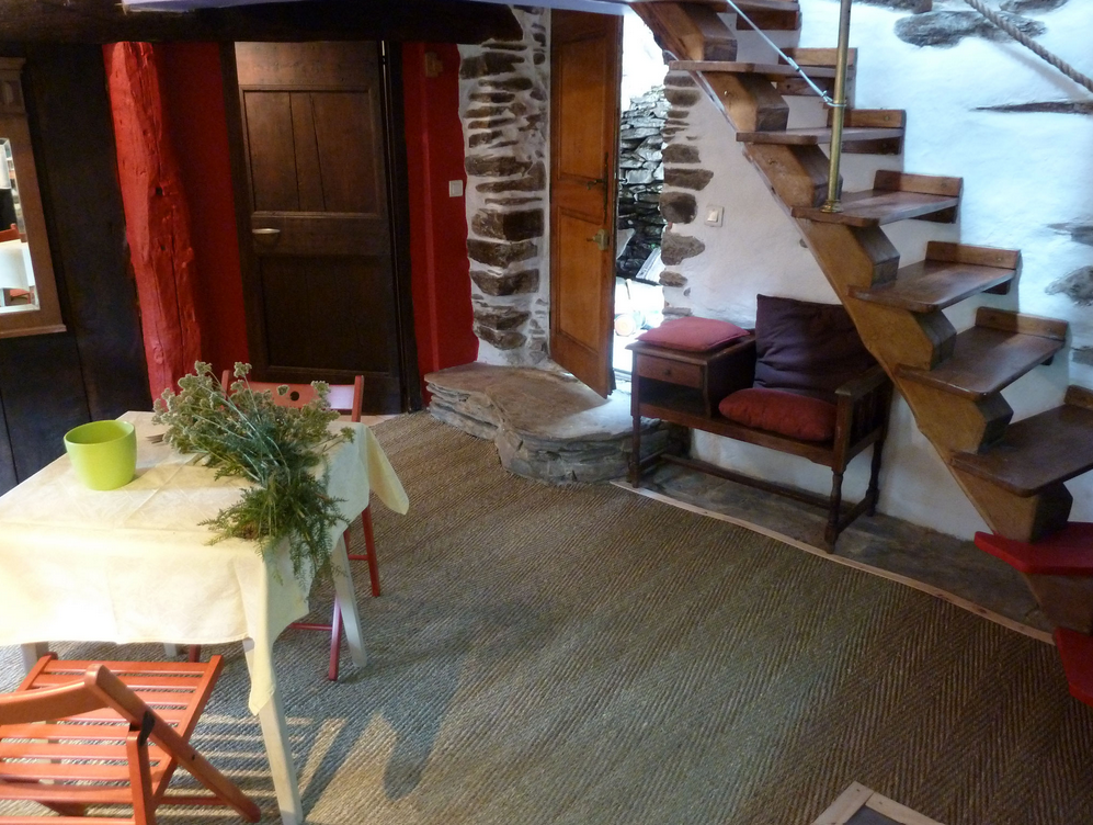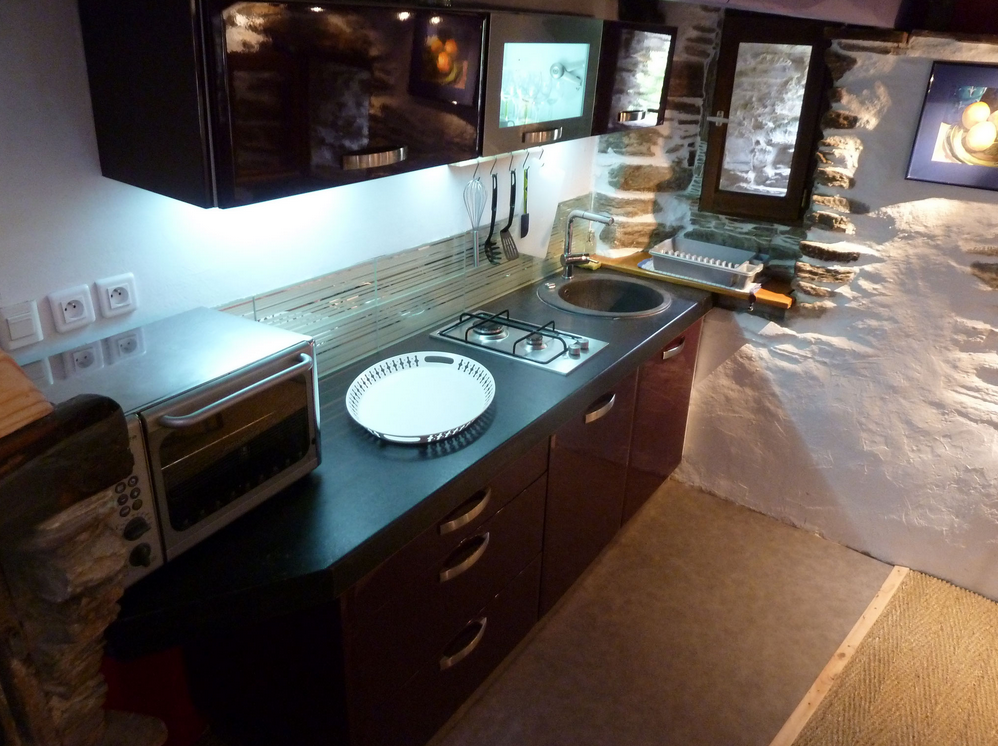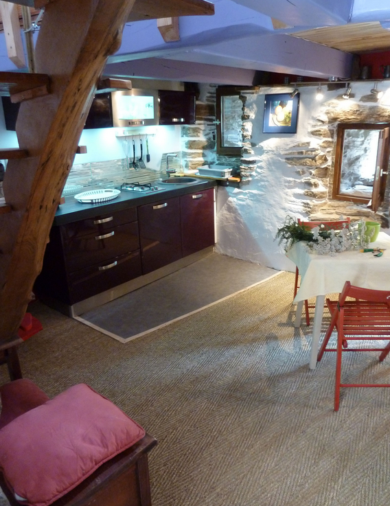 Gîte en duplex. Le "Bambou" pour 2 à 3 personnes. Petite terrasse et hamac pour buller. Cuisine contemporaine dans un espace aux pierres apparentes. Escalier : ne convient pas aux jeunes enfants.