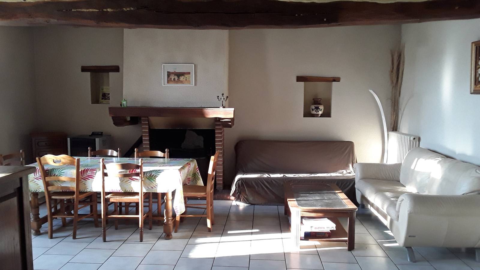 Paysans retraités, nous vous accueillons, au sein d'une ancienne Seigneurie du 15éme, dans notre gîte d'Accueil Paysan de 6 pers : 3 ch., séjour cheminée, petite cour privative avec salon de jardin. Une grande cour close commune est arboré d'un grand marronnier sous lequel les enfants peuvent profiter d'un grand bac à sable ou se détendre sur le grand trempoline ou au tennis de table... Notre gîte est situé à proximité de notre ferme en Agriculture Biologique, reprise par 2 de nos enfants, en production vaches allaitantes, avec présence de poules, d'oies...