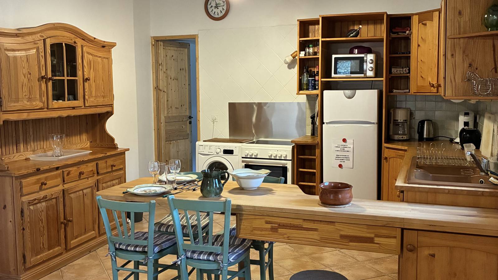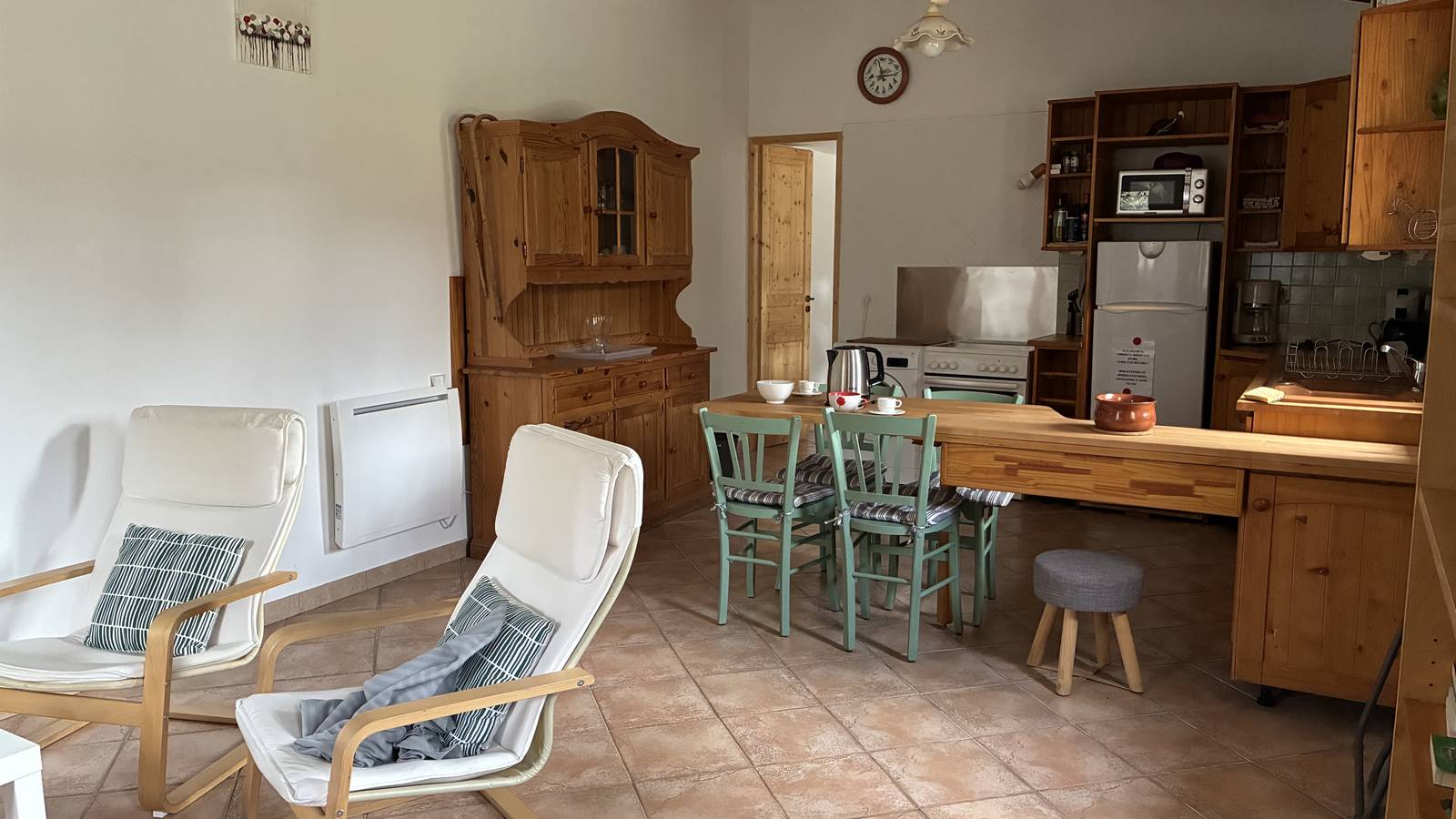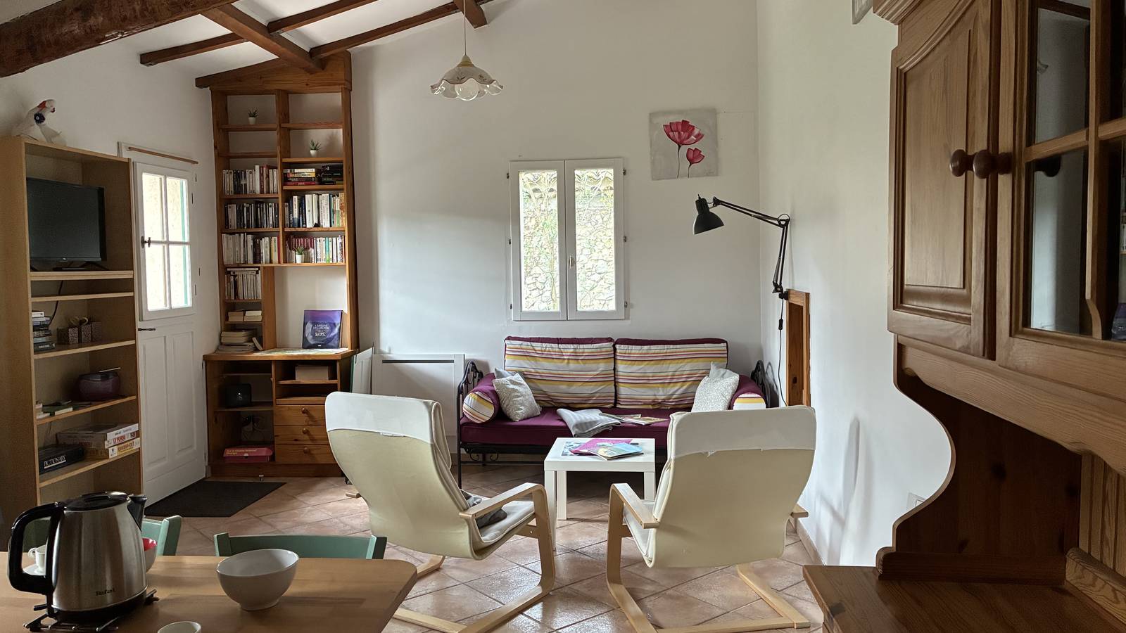 La bâtisse est un ancien cabanon dans lequel étaient rangés les outils. Il est en pierre et a été entièrement restauré : 50m2 agencé de façon à s'y sentir bien. Il dispose d'une grande terrasse plein sud, son point fort est le jardin arboré privatif très agréable pour lire ou se détendre. Une grande pièce : cuisine équipée : plaques vitrocéramiques, four électrique, four micro-onde, lave linge, cafetière, bouilloire... et salon confortable, 2ème pièce : coin nuit avec salle de douche, WC séparé
