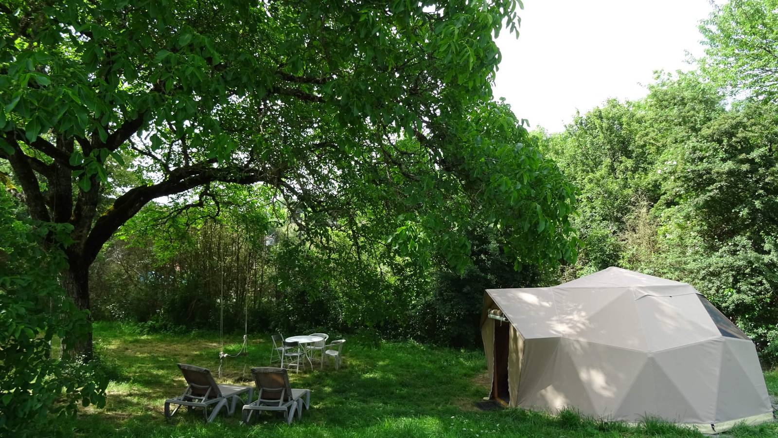 A l'extérieur : 2 transats, une table et des chaises, une balançoire est installée à côté de la tente, dans un grand noyer.