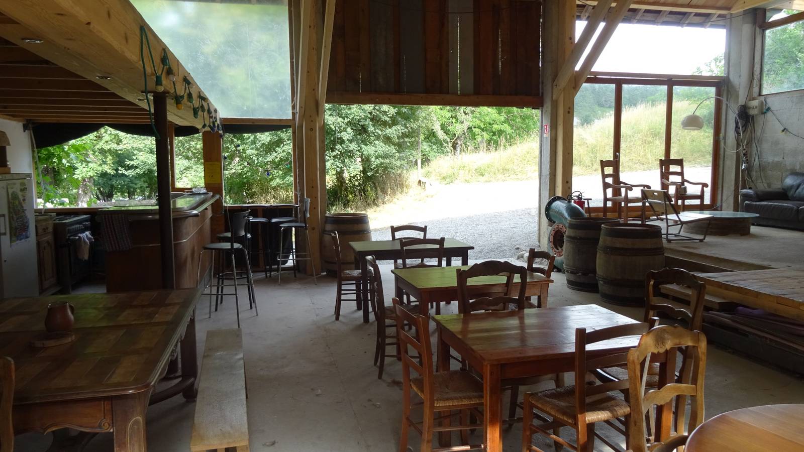 A 50 m de la tente, vous avez accès à une grande salle commune qui comprend une cuisine équipée (gazinière, four, frigos, cafetière, bouilloire, vaisselle), un bar, un espace salle à manger et un espace détente (bibliothèque, canapés et tatamis).