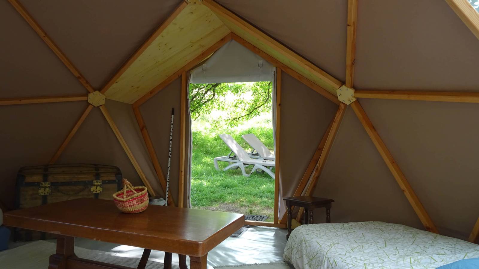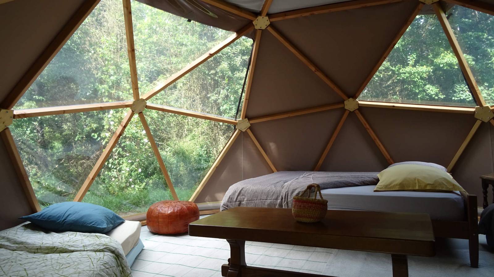 Une petite clairière tranquille, avec un lit douillet sous une belle structure géodésique et le bercement de la rivière
