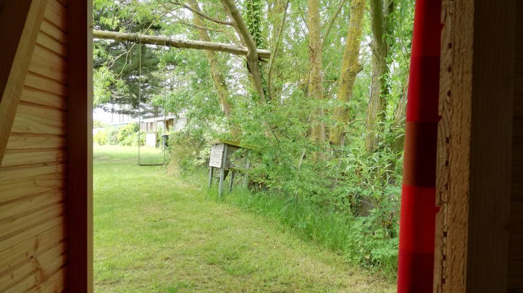 Devant la tente en bois, vous trouverez deux chaises et une table avec vue sur les jardins