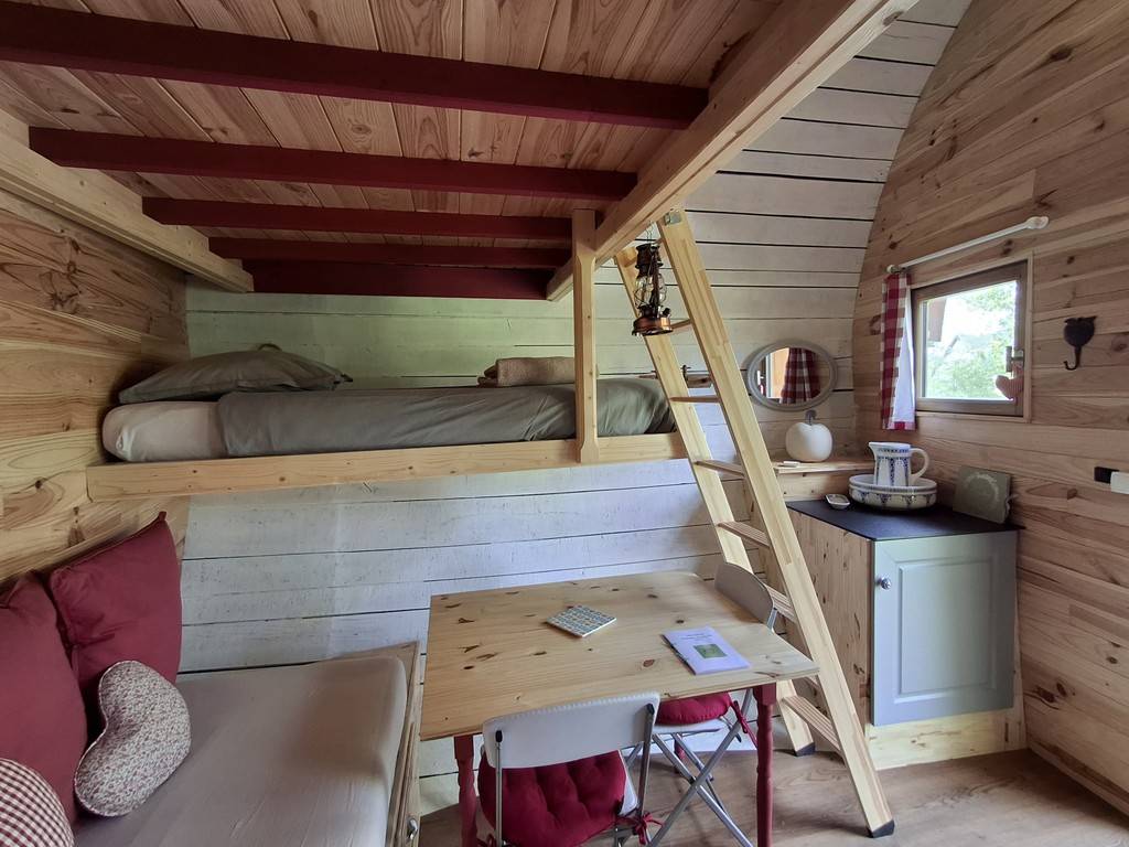 Ce tonneau à la décoration Normande et rempli d’histoire, vous propose quatre couchages (idéal pour un couple avec deux enfants). Sur la mezzanine accessible par une échelle vous trouverez un lit deux personnes (140x190), au rez-de chaussé un lit simple (80x200) qui fait également office de banquette, puis un lit suspendu (80x180). À l’intérieur du tonneau vous disposez de plusieurs rangements pour vos effets personnels.