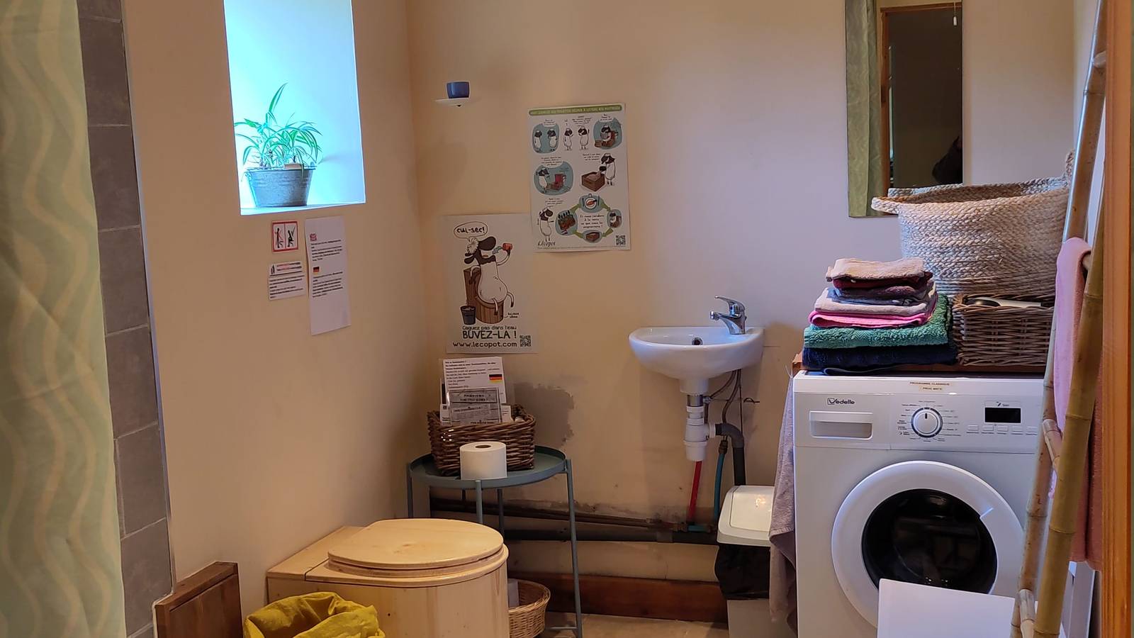 Dans la maison, vous avez accès à la salle de bain avec douche et toilettes sèches. D'autres toilettes sèches sont aussi accessibles non loin des roulottes.