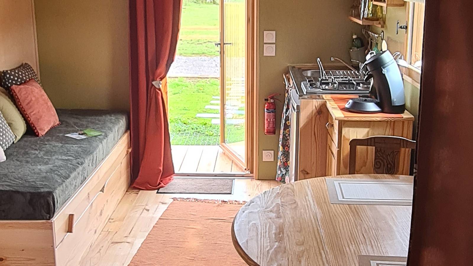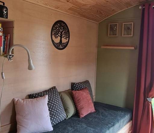 La roulotte accueil confortablement 2 adultes dans l'alcôve, et sur demande pour un accueil supplémentaire, sur la banquette lit, 1 enfant qui n'est pas assez large pour un adulte. Le jardin attenant à la roulotte.