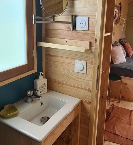 La roulotte est isolée, nous avons fait le choix du bois de Douglas pour l'extérieur, du zinc naturel pour la toiture, et en pin pour l'aménagement intérieur, équipée de toilettes sèches, tri sélectif en place sur l'ensemble des location et pour la ferme.