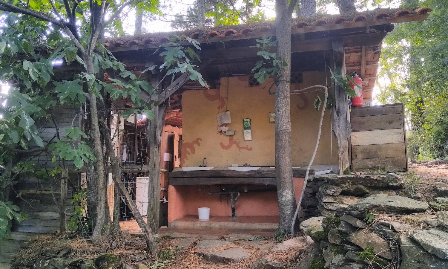 Le bloc sanitaire vous offre l’accès à toilettes sèches et douche chaude, évier, lavabos, prises électriques (pas d'élec dans le tipi), un frigo et un congélateur. On y trouve également tout le tri sélectif des déchets et une compostière.
