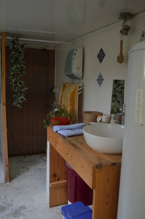 Les sanitaires sont accolés à la yourte ( douche et toilettes sèches ).
