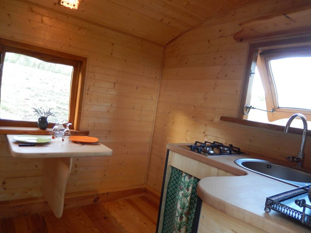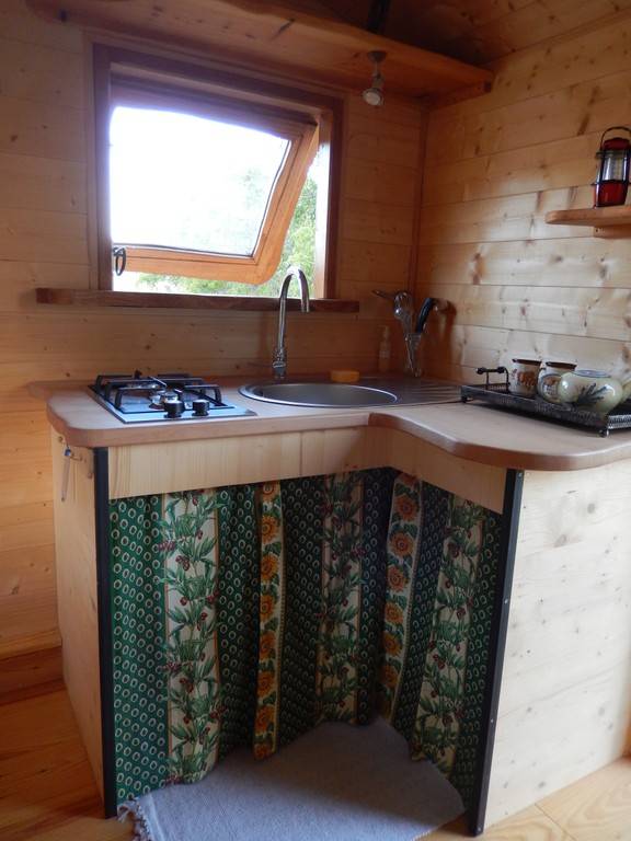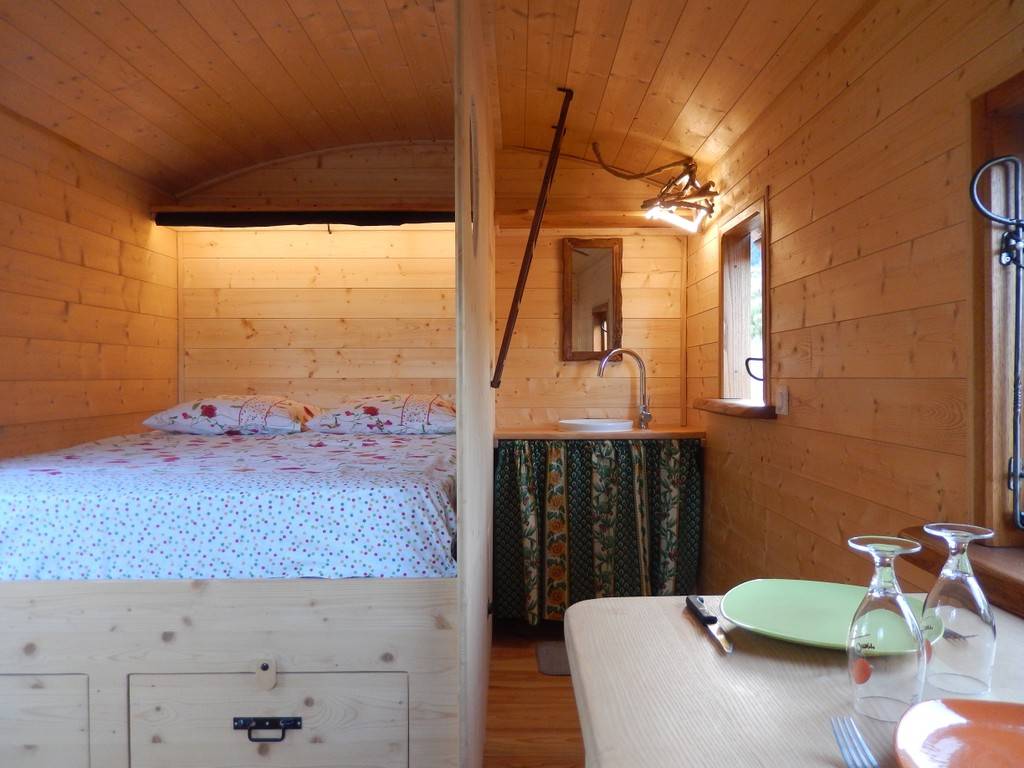 La roulotte fabriquée par un artisan local et aménagée par nos soins n'est connectée à aucun réseau collectif. Elle est équipée d'un éclairage 12 volts et d'une prise USB permettant de recharger tél portables et tablettes, alimentés par un panneau solaire. Pas de 220 v disponible ! L'eau provient de notre source et est chauffée par un système solaire. Les eaux usées sont recyclées via une phyto-épuration, merci de n'utiliser que des produits biodégradables !