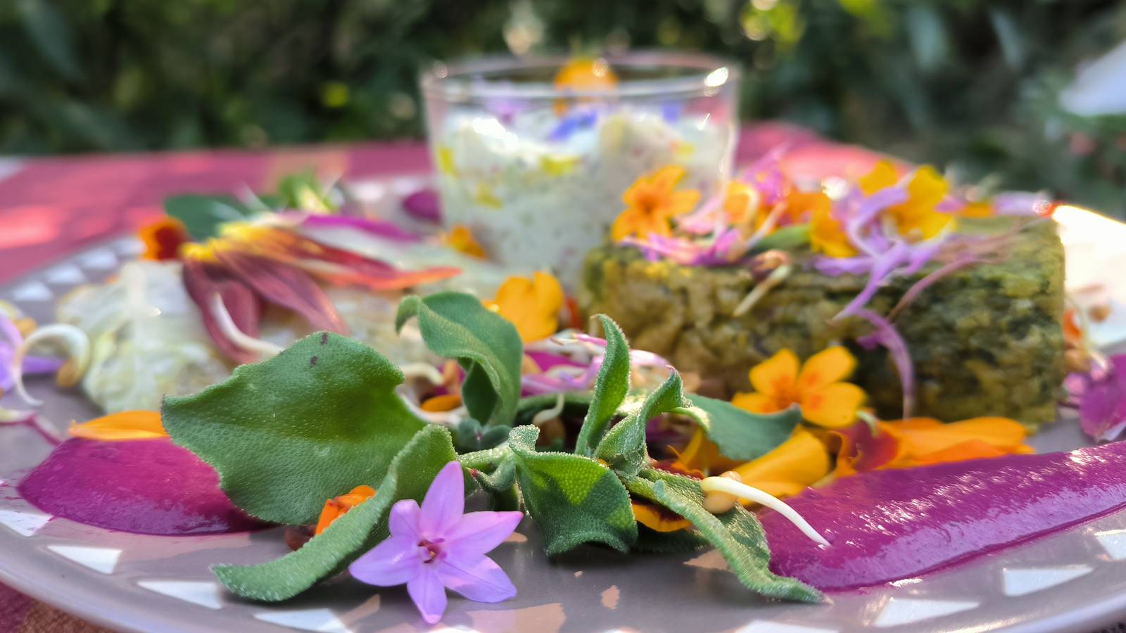 Cuisine bio végétarienne au gré des saisons, mêlant plantes et fleurs du jardin. Surprises et gourmandises garanties !