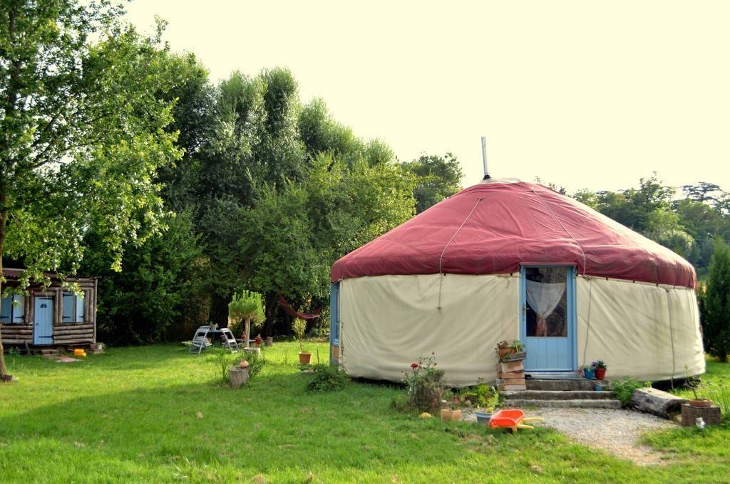 La yourte de 50m² est installé sous les pruniers. Elle a été fabriquée dans l'Aveyron. le sol est en parquet, elle a de larges ouvertures pour laisser entrer la lumière. L'hiver le poêle central la rend très confortable.Notre portrait